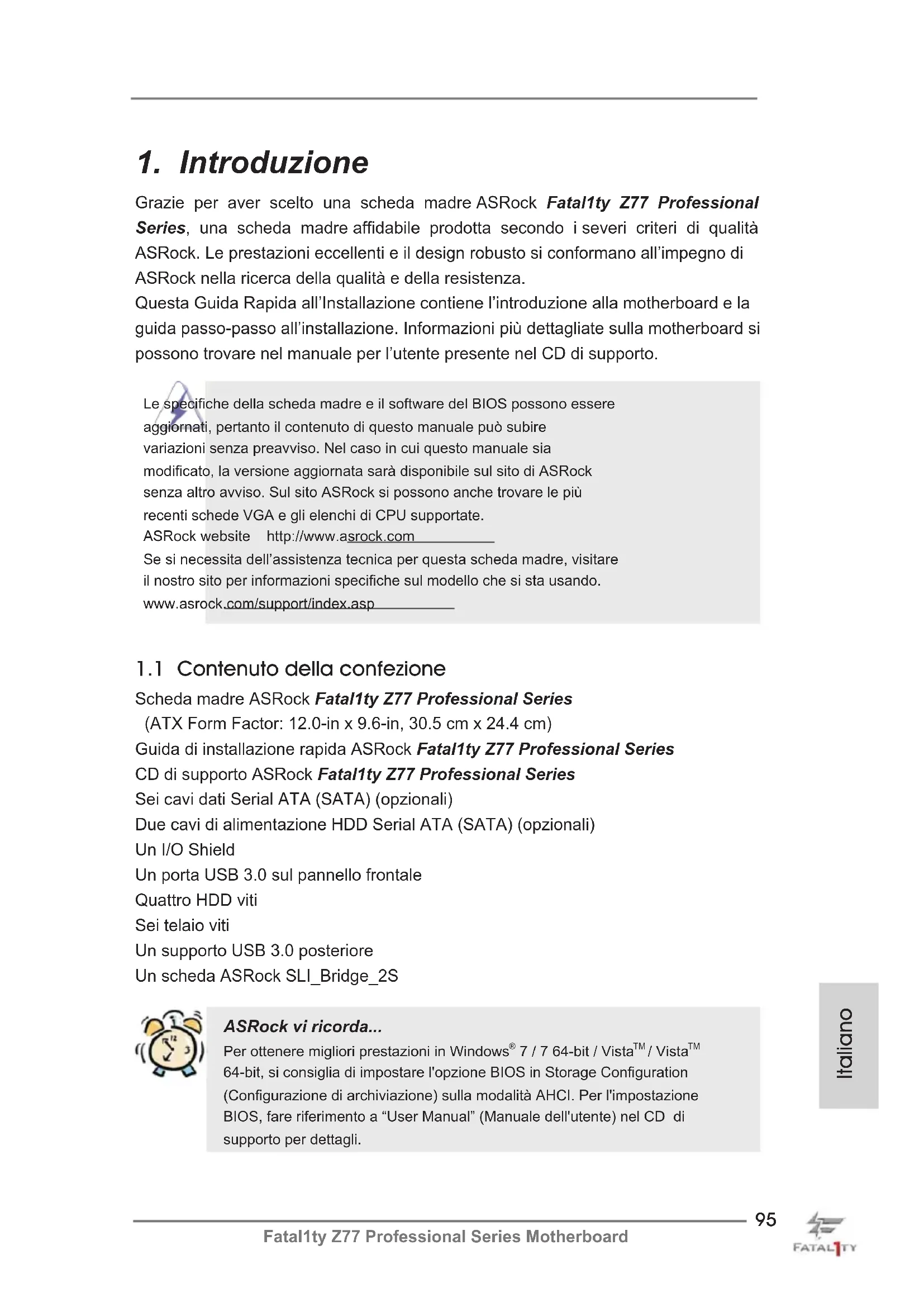 Grazie per aver scelto una scheda madre ASRock Fatal1ty Z77 Professional Series, una scheda madre affidabile prodotta secondo i severi criteri di qualità ASRock. Le prestazioni eccellenti e il design robusto si conformano all’impegno di ASRock nella ricerca della qualità e della resistenza. Questa Guida Rapida all’Installazione contiene l’introduzione alla motherboard e la guida passo-passo all’installazione. Informazioni più dettagliate sulla motherboard si possono trovare nel manuale per l’utente presente nel CD di supporto. Le speciche della scheda madre e il software del BIOS possono essere aggiornati, pertanto il contenuto di questo manuale può subire variazioni senza preavviso. Nel caso in cui questo manuale sia modicato, la versione aggiornata sarà disponibile sul sito di ASRock senza altro avviso. Sul sito ASRock si possono anche trovare le più recenti schede VGA e gli elenchi di CPU supportate. ASRock website http://www.asrock.com Se si necessita dell’assistenza tecnica per questa scheda madre, visitare il nostro sito per informazioni speciche sul modello che si sta usando. www.asrock.com/support/index.asp
