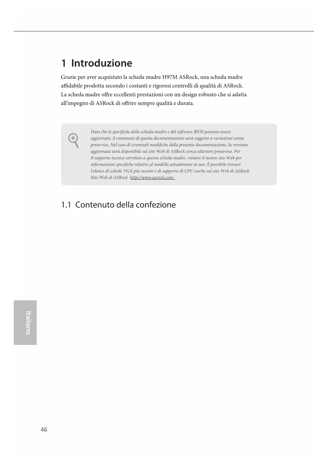 Signal GND46 Italiano 1 Introduzione Grazie per aver acquistato la scheda madre H97M ASRock, una scheda madre adabile prodotta secondo i costanti e rigorosi controlli di qualità di ASRock. La scheda madre ore eccellenti prestazioni con un design robusto che si adatta all'impegno di ASRock di orire sempre qualità e durata.