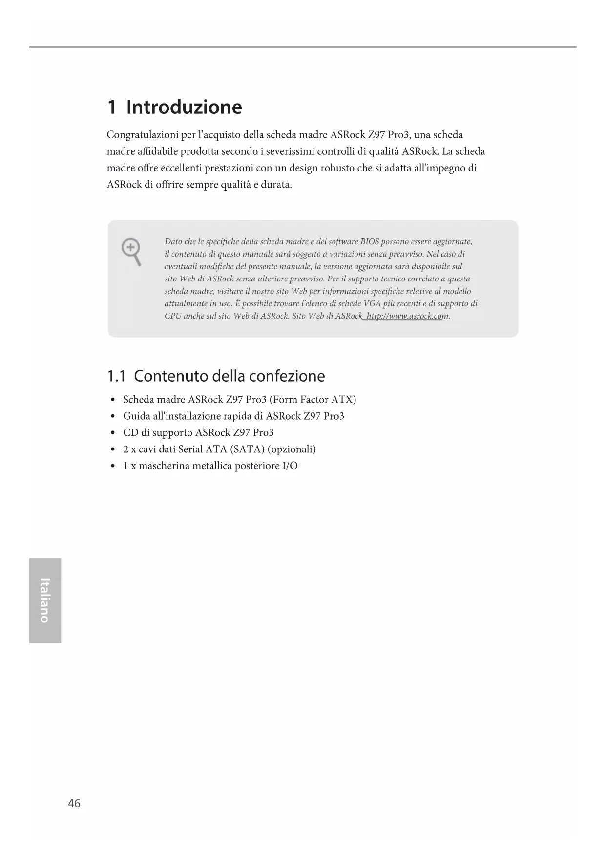 1 x mascherina metallica posteriore I/O Dato che le speciche della scheda madre e del soware BIOS possono essere aggiornate, il contenuto di questo manuale sarà soggetto a variazioni senza preavviso. Nel caso di eventuali modiche del presente manuale, la versione aggiornata sarà disponibile sul sito Web di ASRock senza ulteriore preavviso. Per il supporto tecnico correlato a questa scheda madre, visitare il nostro sito Web per informazioni speciche relative al modello attualmente in uso. È possibile trovare l'elenco di schede VGA più recenti e di supporto di CPU anche sul sito Web di ASRock. Sito Web di ASRock http://www.asrock.com.Z97 Pro3
