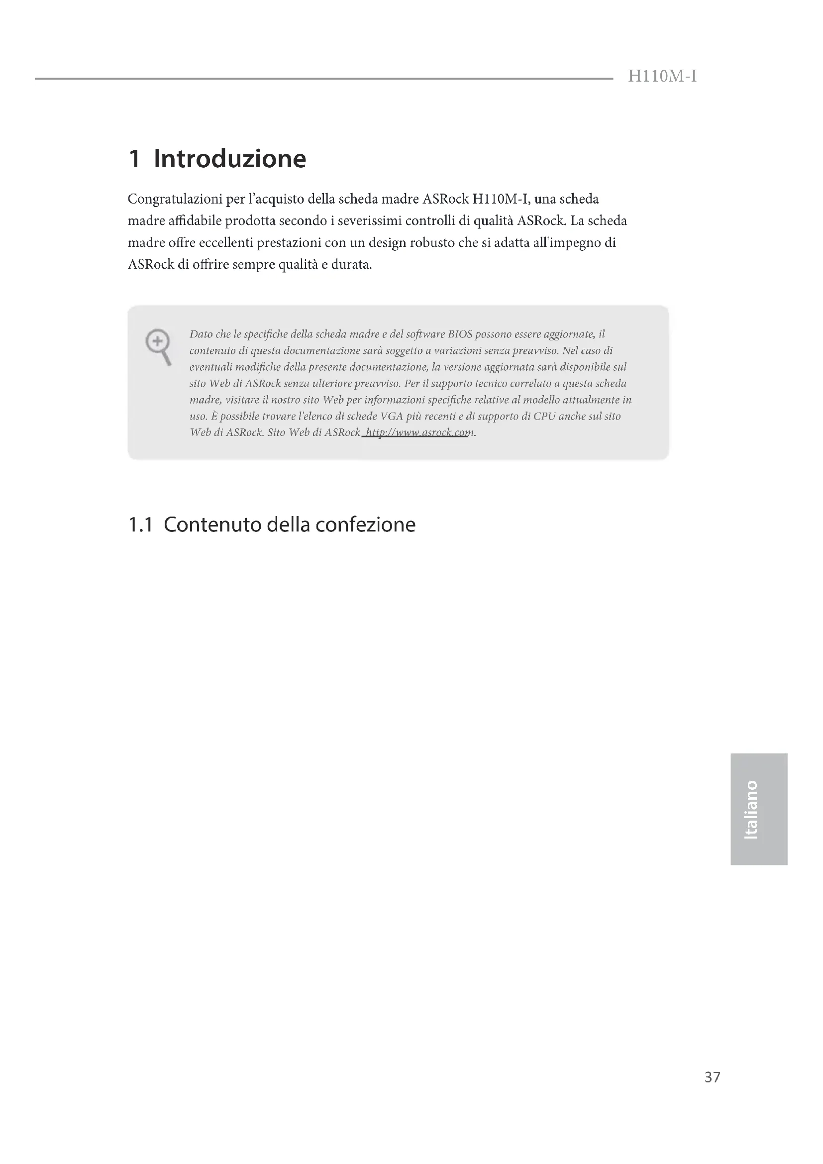 H110M-I Italiano 1 Introduzione Congratulazioni per l’acquisto della scheda madre ASRock H110M-I, una scheda madre adabile prodotta secondo i severissimi controlli di qualità ASRock. La scheda madre ore eccellenti prestazioni con un design robusto che si adatta all'impegno di ASRock di orire sempre qualità e durata.