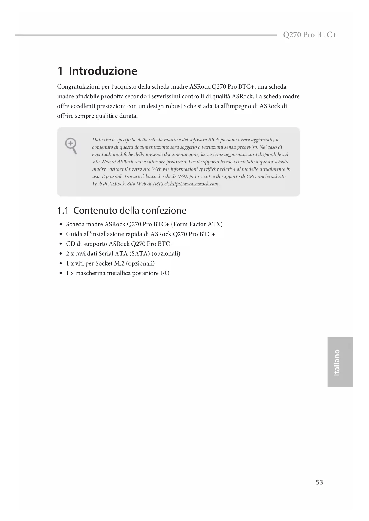 La carte mère dispose de deux boutons intelligents: Bouton d'alimentation et bouton de réinitialisation. Bouton d'alimentation (PWRBTN1) (voir p.1, No. 4) Le bouton d'alimentation permet aux utilisateurs d’allumer/éteindre le système rapidement. Bouton de réinitialisation (RSTBTN1) (voir p.1, No. 5) Le bouton de réinitialisation permet aux utilisateurs de réinitialiser le système rapidement.53 Q270 Pro BTC+ Italiano 1 Introduzione Congratulazioni per l’acquisto della scheda madre ASRock Q270 Pro BTC+, una scheda madre adabile prodotta secondo i severissimi controlli di qualità ASRock. La scheda madre ore eccellenti prestazioni con un design robusto che si adatta all'impegno di ASRock di orire sempre qualità e durata. Dato che le speciche della scheda madre e del soware BIOS possono essere aggiornate, il contenuto di questa documentazione sarà soggetto a variazioni senza preavviso. Nel caso di eventuali modiche della presente documentazione, la versione aggiornata sarà disponibile sul sito Web di ASRock senza ulteriore preavviso. Per il supporto tecnico correlato a questa scheda madre, visitare il nostro sito Web per informazioni speciche relative al modello attualmente in uso. È possibile trovare l'elenco di schede VGA più recenti e di supporto di CPU anche sul sito Web di ASRock. Sito Web di ASRock http://www.asrock.com.