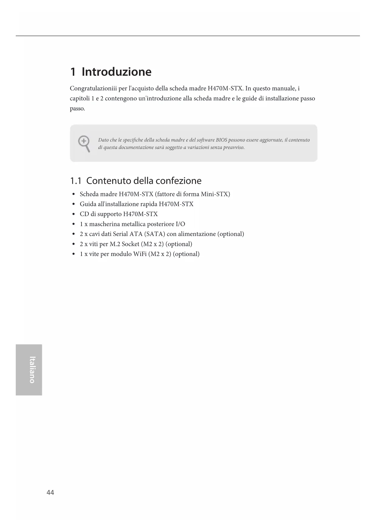 GND Jack detect Audio-L Audio-R Cette embase audio vous permet de raccorder le câble audio pour le casque.44 Italiano Italiano 1 Introduzione Congratulazioniii per l'acquisto della scheda madre H470M-STX. In questo manuale, i capitoli 1 e 2 contengono un'introduzione alla scheda madre e le guide di installazione passo passo. Dato che le speciche della scheda madre e del soware BIOS possono essere aggiornate, il contenuto di questa documentazione sarà soggetto a variazioni senza preavviso.