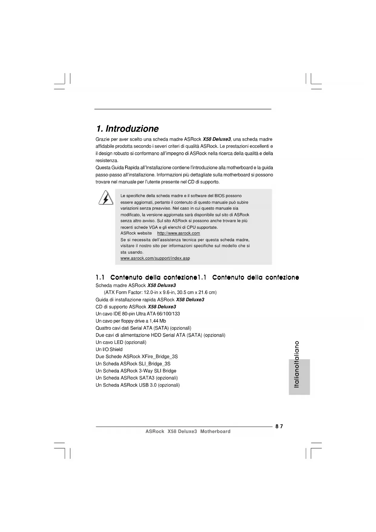 Grazie per aver scelto una scheda madre ASRock X58 Deluxe3, una scheda madre affidabile prodotta secondo i severi criteri di qualità ASRock. Le prestazioni eccellenti e il design robusto si conformano all’impegno di ASRock nella ricerca della qualità e della resistenza. Questa Guida Rapida all’Installazione contiene l’introduzione alla motherboard e la guida passo-passo all’installazione. Informazioni più dettagliate sulla motherboard si possono trovare nel manuale per l’utente presente nel CD di supporto. Le specifiche della scheda madre e il software del BIOS possonoessere aggiornati, pertanto il contenuto di questo manuale può subirevariazioni senza preavviso. Nel caso in cui questo manuale siamodificato, la versione aggiornata sarà disponibile sul sito di ASRocksenza altro avviso. Sul sito ASRock si possono anche trovare le piùrecenti schede VGA e gli elenchi di CPU supportate. ASRock website http://www.asrock.com Se si necessita dell’assistenza tecnica per questa scheda madre,visitare il nostro sito per informazioni specifiche sul modello che sista usando.www.asrock.com/support/index.asp