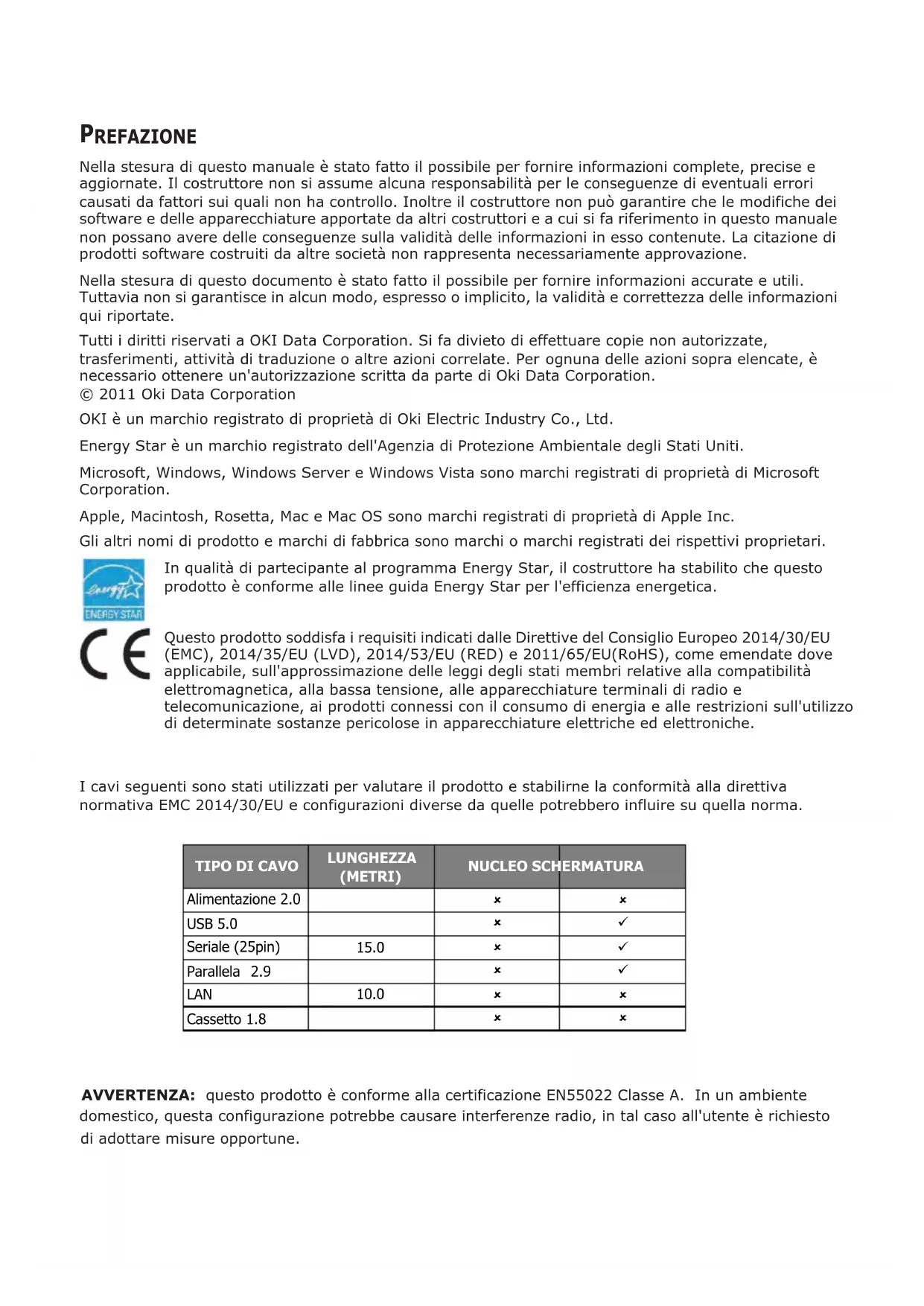 Nella stesura di questo manuale è stato fatto il possibile per fornire informazioni complete, precise e aggiornate. Il costruttore non si assume alcuna responsabilità per le conseguenze di eventuali errori causati da fattori sui quali non ha controllo. Inoltre il costruttore non può garantire che le modifiche dei software e delle apparecchiature apportate da altri costruttori e a cui si fa riferimento in questo manuale non possano avere delle conseguenze sulla validità delle informazioni in esso contenute. La citazione di prodotti software costruiti da altre società non rappresenta necessariamente approvazione. Nella stesura di questo documento è stato fatto il possibile per fornire informazioni accurate e utili. Tuttavia non si garantisce in alcun modo, espresso o implicito, la validità e correttezza delle informazioni qui riportate. Tutti i diritti riservati a OKI Data Corporation. Si fa divieto di effettuare copie non autorizzate, trasferimenti, attività di traduzione o altre azioni correlate. Per ognuna delle azioni sopra elencate, è necessario ottenere un'autorizzazione scritta da parte di Oki Data Corporation. © 2011 Oki Data Corporation OKI è un marchio registrato di proprietà di Oki Electric Industry Co., Ltd. Energy Star è un marchio registrato dell'Agenzia di Protezione Ambientale degli Stati Uniti. Microsoft, Windows, Windows Server e Windows Vista sono marchi registrati di proprietà di Microsoft Corporation. Apple, Macintosh, Rosetta, Mac e Mac OS sono marchi registrati di proprietà di Apple Inc. Gli altri nomi di prodotto e marchi di fabbrica sono marchi o marchi registrati dei rispettivi proprietari. In qualità di partecipante al programma Energy Star, il costruttore ha stabilito che questo prodotto è conforme alle linee guida Energy Star per l'efficienza energetica. Questo prodotto soddisfa i requisiti indicati dalle Direttive del Consiglio Europeo 2014/30/EU (EMC), 2014/35/EU (LVD), 2014/53/EU (RED) e 2011/65/EU(RoHS), come emendate dove applicabile, sull'approssimazione delle leggi degli stati membri relative alla compatibilità elettromagnetica, alla bassa tensione, alle apparecchiature terminali di radio e telecomunicazione, ai prodotti connessi con il consumo di energia e alle restrizioni sull'utilizzo di determinate sostanze pericolose in apparecchiature elettriche ed elettroniche. I cavi seguenti sono stati utilizzati per valutare il prodotto e stabilirne la conformità alla direttiva normativa EMC 2014/30/EU e configurazioni diverse da quelle potrebbero influire su quella norma. AVVERTENZA: questo prodotto è conforme alla certificazione EN55022 Classe A. In un ambiente domestico, questa configurazione potrebbe causare interferenze radio, in tal caso all'utente è richiesto di adottare misure opportune.