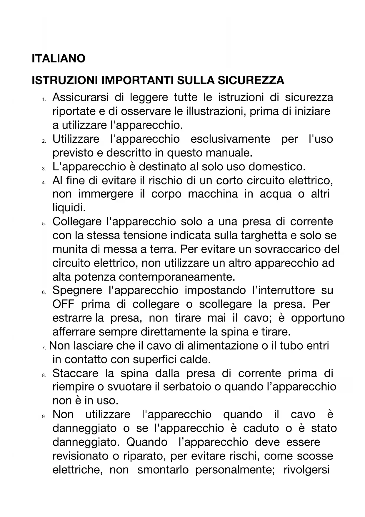 Collegamento scorretto alla presa elettrica Ricollegare correttamente l’unità alla presa elettrica La manopola di controllo della temperatura è regolata su “MIN” Regolare la manopola di controllo della temperatura sulla posizione desiderata, seguendo la tabella delle impostazioni predefinite Malfunzionamenti sconosciuti Rivolgersi a un tecnico qualificato o al produttore o al servizio di assistenza per fare esaminare e riparare l’apparecchio Una volta raggiunta la temperatura desiderata, non vi è fuoriuscita di vapore quando si preme il pulsante corrispondente