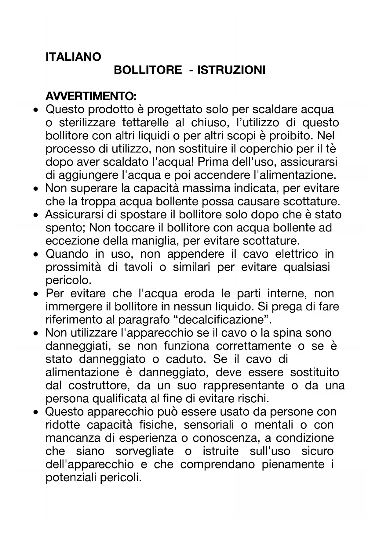 - Assicurarsi di spostare il bollitore solo dopo che è stato spento; Non toccare il bollitore con acqua bollente ad eccezione della maniglia, per evitare scottature.