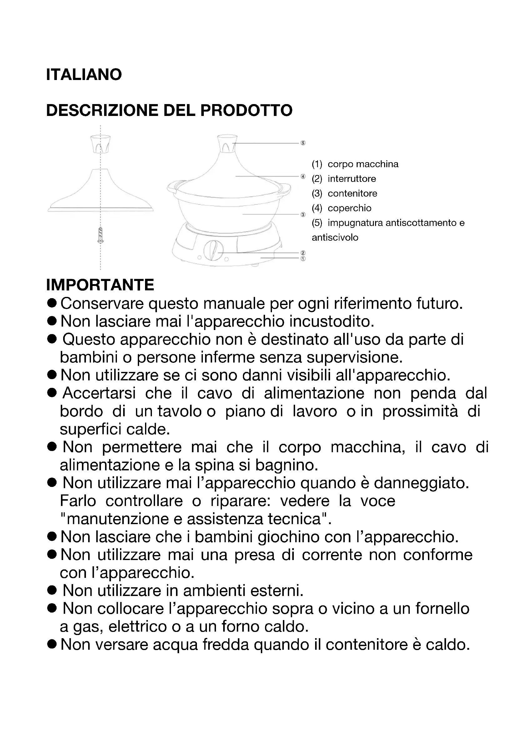 IMPORTANTE l Conservare questo manuale per ogni riferimento futuro. l Non lasciare mai l'apparecchio incustodito. l Questo apparecchio non è destinato all'uso da parte di bambini o persone inferme senza supervisione. l Non utilizzare se ci sono danni visibili all'apparecchio. l Accertarsi che il cavo di alimentazione non penda dal bordo di un tavolo o piano di lavoro o in prossimità di superfici calde. l Non permettere mai che il corpo macchina, il cavo di alimentazione e la spina si bagnino. l Non utilizzare mai l’apparecchio quando è danneggiato. Farlo controllare o riparare: vedere la voce "manutenzione e assistenza tecnica". l Non lasciare che i bambini giochino con l’apparecchio. l Non utilizzare mai una presa di corrente non conforme con l’apparecchio. l Non utilizzare in ambienti esterni. l Non collocare l’apparecchio sopra o vicino a un fornello a gas, elettrico o a un forno caldo. l Non versare acqua fredda quando il contenitore è caldo.l Non riscaldare il contenitore direttamente sul fuoco. l Questo apparecchio può essere usato da persone con ridotte capacità fisiche, sensoriali o mentali o con mancanza di esperienza o conoscenza, a condizione che siano sorvegliate o istruite sull'uso sicuro dell'apparecchio e che comprendano pienamente i potenziali pericoli. l Accertarsi sempre che i bambini non giochino in prossimità dell’apparecchio. l Il dispositivo non deve essere utilizzato se è stato lasciato cadere, sono visibili evidenti segni di danneggiamento o se presenta perdite. l Non utilizzare l'apparecchio se il cavo o la spina sono danneggiati, se non funziona correttamente o se è stato danneggiato o caduto. Se il cavo di alimentazione è danneggiato, deve essere sostituito dal costruttore, da un suo rappresentante o da una persona qualificata al fine di evitare rischi. l Questo apparecchio può essere utilizzato da bambini di età pari o superiore a 8 anni, a condizione che siano supervisionati o che siano stati istruiti sull'uso sicuro dell'apparecchio e che ne comprendano i pericoli. l La pulizia e la manutenzione da parte dell'utente non devono essere eseguite da bambini, a meno che non abbiano più di 8 anni e siano sotto la supervisione di un adulto. l Tenere il dispositivo e il relativo cavo fuori dalla portata dei bambini di età inferiore a 8 anni. l Quando si utilizzano dispositivi elettrici, è necessario adottare sempre precauzioni di sicurezza per prevenire il rischio di incendio, scosse elettriche e/o lesioni dovute a un uso improprio. l Verificare che la tensione indicata sulla targhetta del dispositivo corrisponda a quella del proprio impiantoelettrico. In caso contrario, contattare il rivenditore e non collegare il dispositivo. l Non lasciare mai il dispositivo incustodito mentre è in uso. l Non aprire mai l'apparecchio dalla parte anteriore, posizionarsi sempre leggermente di lato per non scottarsi con il vapore. l Si prega di tenere a disposizione questo documento e di consegnarlo al futuro proprietario in caso di trasferimento del proprio dispositivo. l L'apparecchio è stato progettato esclusivamente per uso domestico. Non è stato progettato per essere utilizzato nei seguenti casi non coperti dalla garanzia: - nelle aree cucina riservate al personale di negozi, uffici e altri ambienti professionali, - nelle locande dell'agriturismo, - da clienti di hotel, motel e altri ambienti residenziali, - in ambienti tipo bed and breakfast.