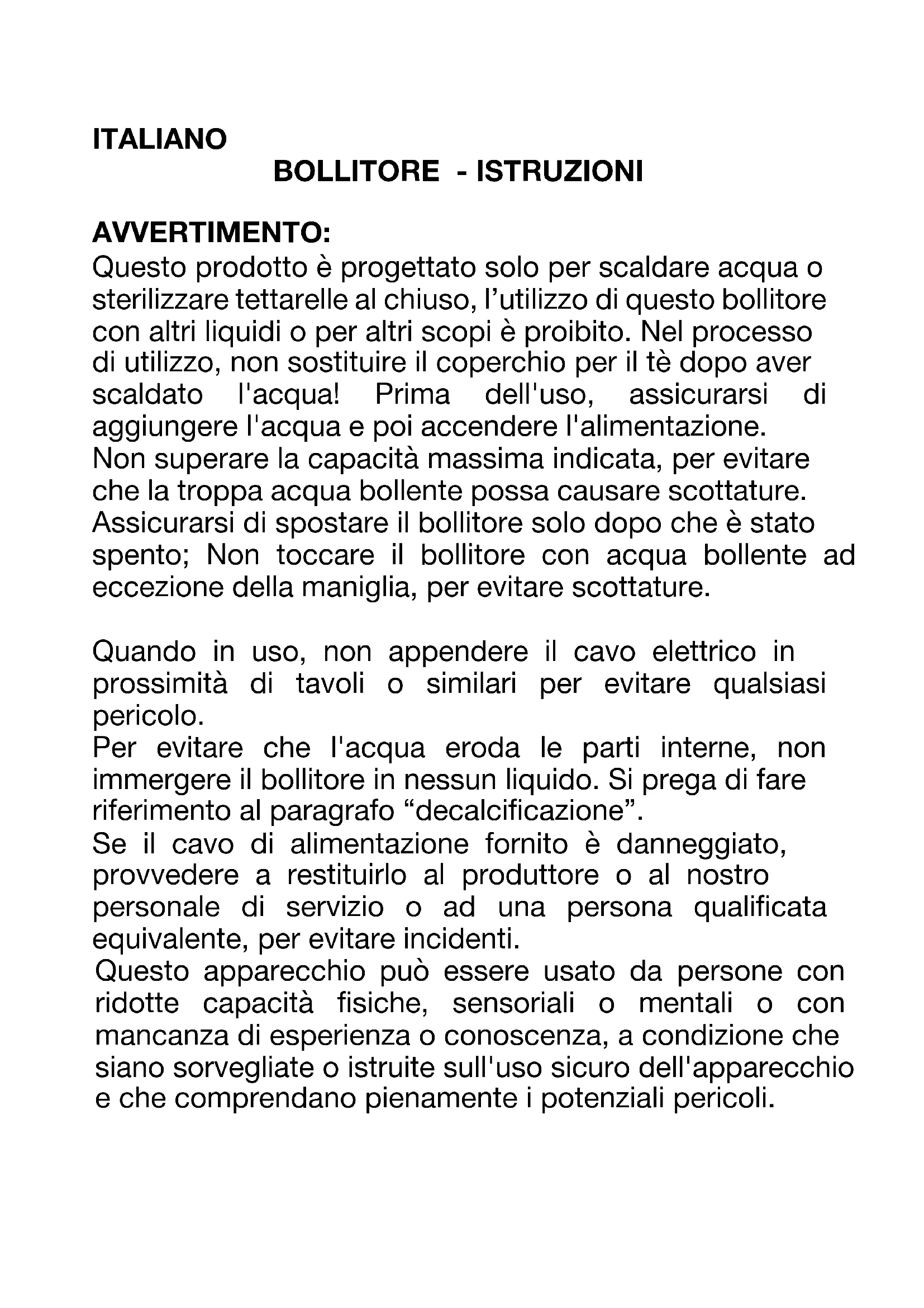 AVVERTIMENTO: Questo prodotto è progettato solo per scaldare acqua o sterilizzare tettarelle al chiuso, l’utilizzo di questo bollitore con altri liquidi o per altri scopi è proibito. Nel processo di utilizzo, non sostituire il coperchio per il tè dopo aver scaldato l'acqua! Prima dell'uso, assicurarsi di aggiungere l'acqua e poi accendere l'alimentazione. Non superare la capacità massima indicata, per evitare che la troppa acqua bollente possa causare scottature. Assicurarsi di spostare il bollitore solo dopo che è stato spento; Non toccare il bollitore con acqua bollente ad eccezione della maniglia, per evitare scottature. Quando in uso, non appendere il cavo elettrico in prossimità di tavoli o similari per evitare qualsiasi pericolo. Per evitare che l'acqua eroda le parti interne, non immergere il bollitore in nessun liquido. Si prega di fare riferimento al paragrafo “decalcificazione”. Se il cavo di alimentazione fornito è danneggiato, provvedere a restituirlo al produttore o al nostro personale di servizio o ad una persona qualificata equivalente, per evitare incidenti. Questo apparecchio può essere usato da persone con ridotte capacità fisiche, sensoriali o mentali o con mancanza di esperienza o conoscenza, a condizione che siano sorvegliate o istruite sull'uso sicuro dell'apparecchio e che comprendano pienamente i potenziali pericoli.I bambini dovrebbero essere sorvegliati per assicurarsi che non giochino con l'apparecchio.