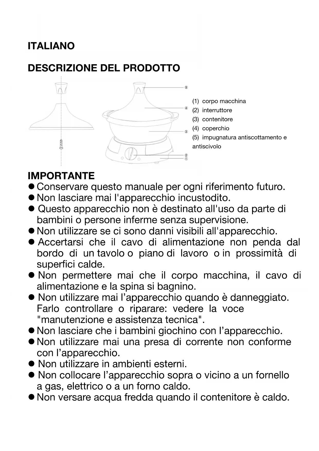 IMPORTANTE l Conservare questo manuale per ogni riferimento futuro. l Non lasciare mai l'apparecchio incustodito. l Questo apparecchio non è destinato all'uso da parte di bambini o persone inferme senza supervisione. l Non utilizzare se ci sono danni visibili all'apparecchio. l Accertarsi che il cavo di alimentazione non penda dal bordo di un tavolo o piano di lavoro o in prossimità di superfici calde. l Non permettere mai che il corpo macchina, il cavo di alimentazione e la spina si bagnino. l Non utilizzare mai l’apparecchio quando è danneggiato. Farlo controllare o riparare: vedere la voce "manutenzione e assistenza tecnica". l Non lasciare che i bambini giochino con l’apparecchio. l Non utilizzare mai una presa di corrente non conforme con l’apparecchio. l Non utilizzare in ambienti esterni. l Non collocare l’apparecchio sopra o vicino a un fornello a gas, elettrico o a un forno caldo. l Non versare acqua fredda quando il contenitore è caldo.l Non riscaldare il contenitore direttamente sul fuoco. l Questo dispositivo non è destinato all'uso da parte di persone con capacità fisiche, mentali o sensoriali ridotte, o da persone con scarsa conoscenza (inclusi i bambini), salvo che una persona responsabile della loro sicurezza non abbia fornito loro le dovute indicazioni. l Accertarsi sempre che i bambini non giochino in prossimità dell’apparecchio. l Il dispositivo non deve essere utilizzato se è stato lasciato cadere, sono visibili evidenti segni di danneggiamento o se presenta perdite. l Non utilizzare l'apparecchio se il cavo o la spina sono danneggiati, se non funziona correttamente o se è stato danneggiato o caduto. Se il cavo di alimentazione è danneggiato, deve essere sostituito dal costruttore, da un suo rappresentante o da una persona qualificata al fine di evitare rischi. l Questo apparecchio può essere utilizzato da bambini a partire da 8 anni, purché sorvegliati e istruiti all'uso sicuro dell'apparecchio e pienamente a conoscenza dei pericoli che comporta. l La pulizia e la manutenzione non devono essere eseguite da bambini a meno che abbiano più di 8 anni e siano sorvegliati da un adulto. l Conservare l'apparecchio e il cavo di alimentazione fuori dalla portata di bambini di età inferiore a 8 anni. l Quando si utilizzano apparecchiature elettriche, è necessario adottare sempre misure di sicurezza per prevenire il rischio di incendi, scosse elettriche e/o lesioni in caso di uso improprio. l Accertarsi che la tensione nominale sulla targhetta corrisponda alla tensione principale della vostra installazione. In caso contrario, contattare il rivenditore enon collegare l'unità. l Non lasciare mai l'unità incustodita durante il funzionamento. l Si prega di tenere questo documento a portata di mano e di consegnarlo al futuro proprietario in caso di trasferimento del dispositivo. l Non aprire mai l'apparecchio dalla parte anteriore, posizionarsi sempre leggermente di lato per evitare di scottarsi con il vapore. l Il dispositivo non deve essere utilizzato se è stato lasciato cadere, sono visibili evidenti segni di danneggiamento o se presenta perdite.