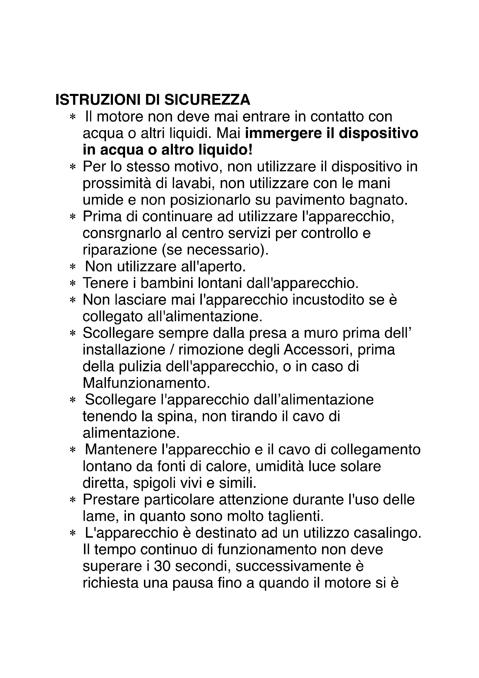 - L'apparecchio è destinato ad un utilizzo casalingo. Il tempo continuo di funzionamento non deve superare i 30 secondi, successivamente è richiesta una pausa fino a quando il motore si èraffreddato completamente.