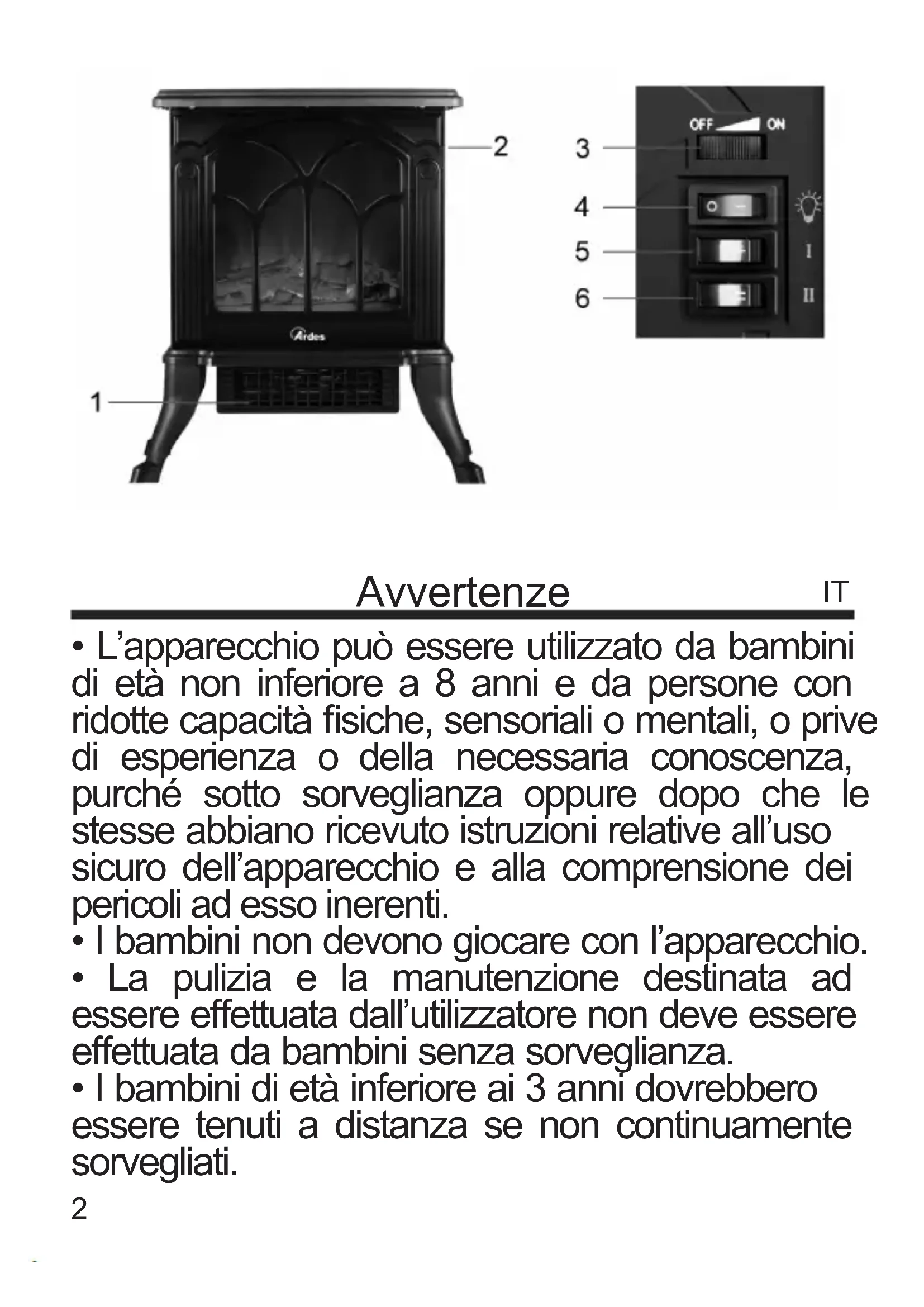 - I bambini di età compresa tra i 3 e gli 8 anni devono solamente accendere/spegnere l’apparecchio purché sia stato posto o installato nella sua normale posizione di funzionamento e che essi ricevano sorveglianza o istruzioni riguardanti l’utilizzo dell’apparecchio in sicurezza e ne capiscano i pericoli.
