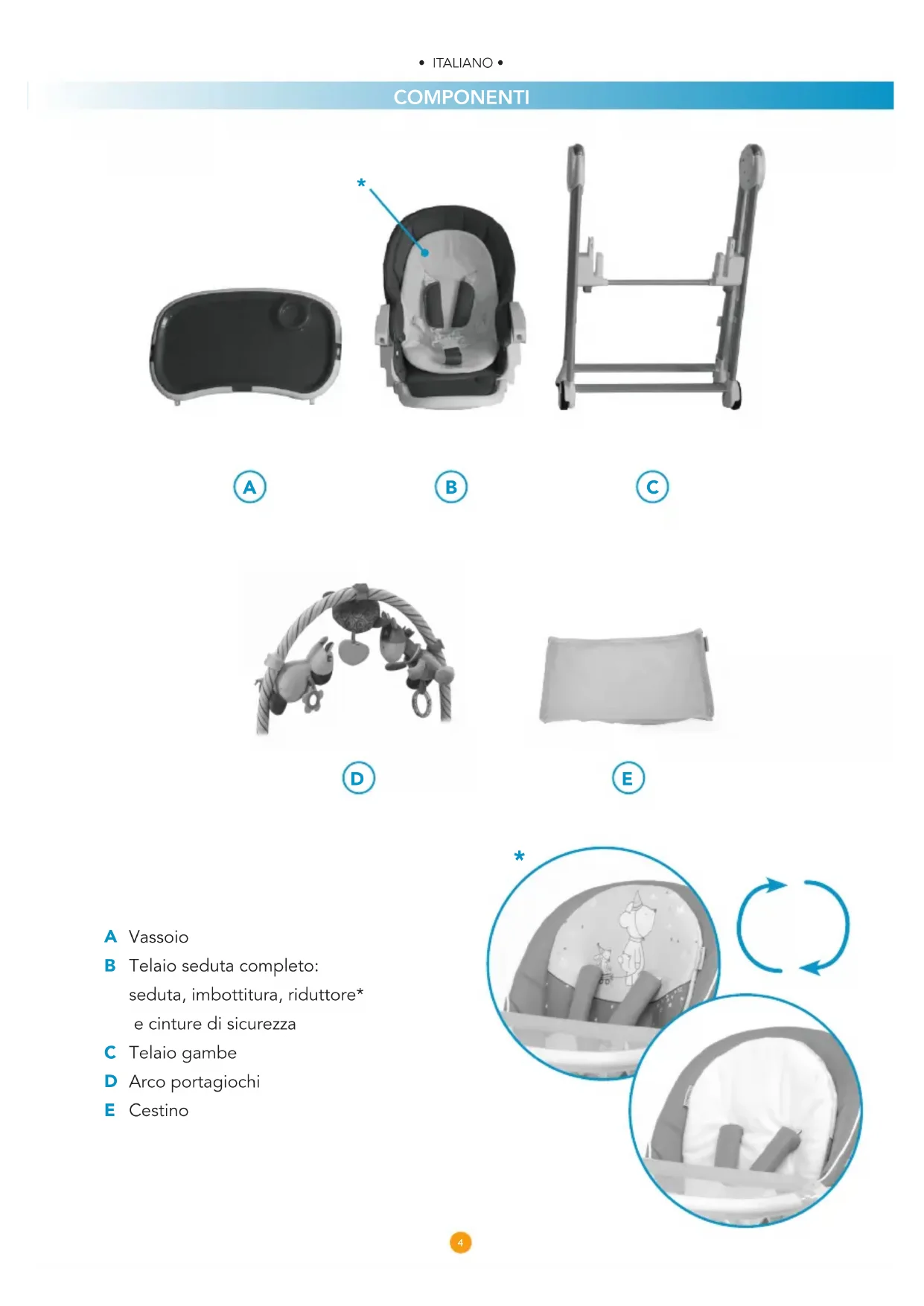 - ITALIANO • • ITALIANO • COMPONENTI D E Vassoio Telaio seduta completo: seduta, imbottitura, riduttore* e cinture di sicurezza Telaio gambe Arco portagiochi Cestino