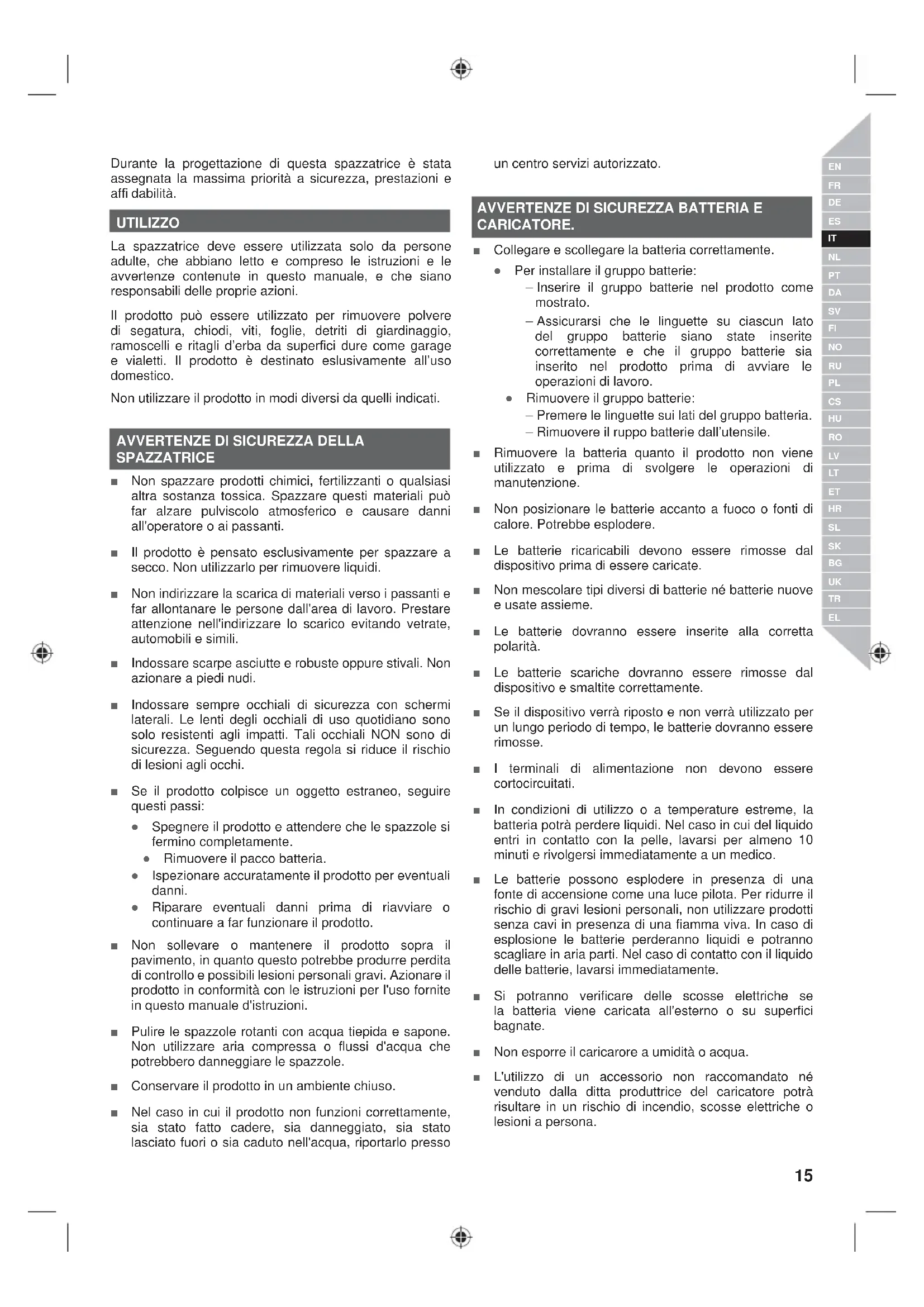 SPAZZATRICE Ŷ Non spazzare prodotti chimici, fertilizzanti o qualsiasi altra sostanza tossica. Spazzare questi materiali può far alzare pulviscolo atmosferico e causare danni all'operatore o ai passanti. Ŷ Il prodotto è pensato esclusivamente per spazzare a secco. Non utilizzarlo per rimuovere liquidi. Ŷ Non indirizzare la scarica di materiali verso i passanti e far allontanare le persone dall'area di lavoro. Prestare attenzione nell'indirizzare lo scarico evitando vetrate, automobili e simili. Ŷ Indossare scarpe asciutte e robuste oppure stivali. Non azionare a piedi nudi. Ŷ Indossare sempre occhiali di sicurezza con schermi laterali. Le lenti degli occhiali di uso quotidiano sono solo resistenti agli impatti. Tali occhiali NON sono di sicurezza. Seguendo questa regola si riduce il rischio di lesioni agli occhi. Ŷ Se il prodotto colpisce un oggetto estraneo, seguire questi passi: Ɣ Spegnere il prodotto e attendere che le spazzole si fermino completamente. Ɣ Rimuovere il pacco batteria. Ɣ Ispezionare accuratamente il prodotto per eventuali danni. Ɣ Riparare eventuali danni prima di riavviare o continuare a far funzionare il prodotto. Ŷ Non sollevare o mantenere il prodotto sopra il pavimento, in quanto questo potrebbe produrre perdita di controllo e possibili lesioni personali gravi. Azionare il prodotto in conformità con le istruzioni per l'uso fornite in questo manuale d'istruzioni. Ŷ Pulire le spazzole rotanti con acqua tiepida e sapone. Non utilizzare aria compressa o flussi d'acqua che potrebbero danneggiare le spazzole. Ŷ Conservare il prodotto in un ambiente chiuso. Ŷ Nel caso in cui il prodotto non funzioni correttamente, sia stato fatto cadere, sia danneggiato, sia stato lasciato fuori o sia caduto nell'acqua, riportarlo presso un centro servizi autorizzato.