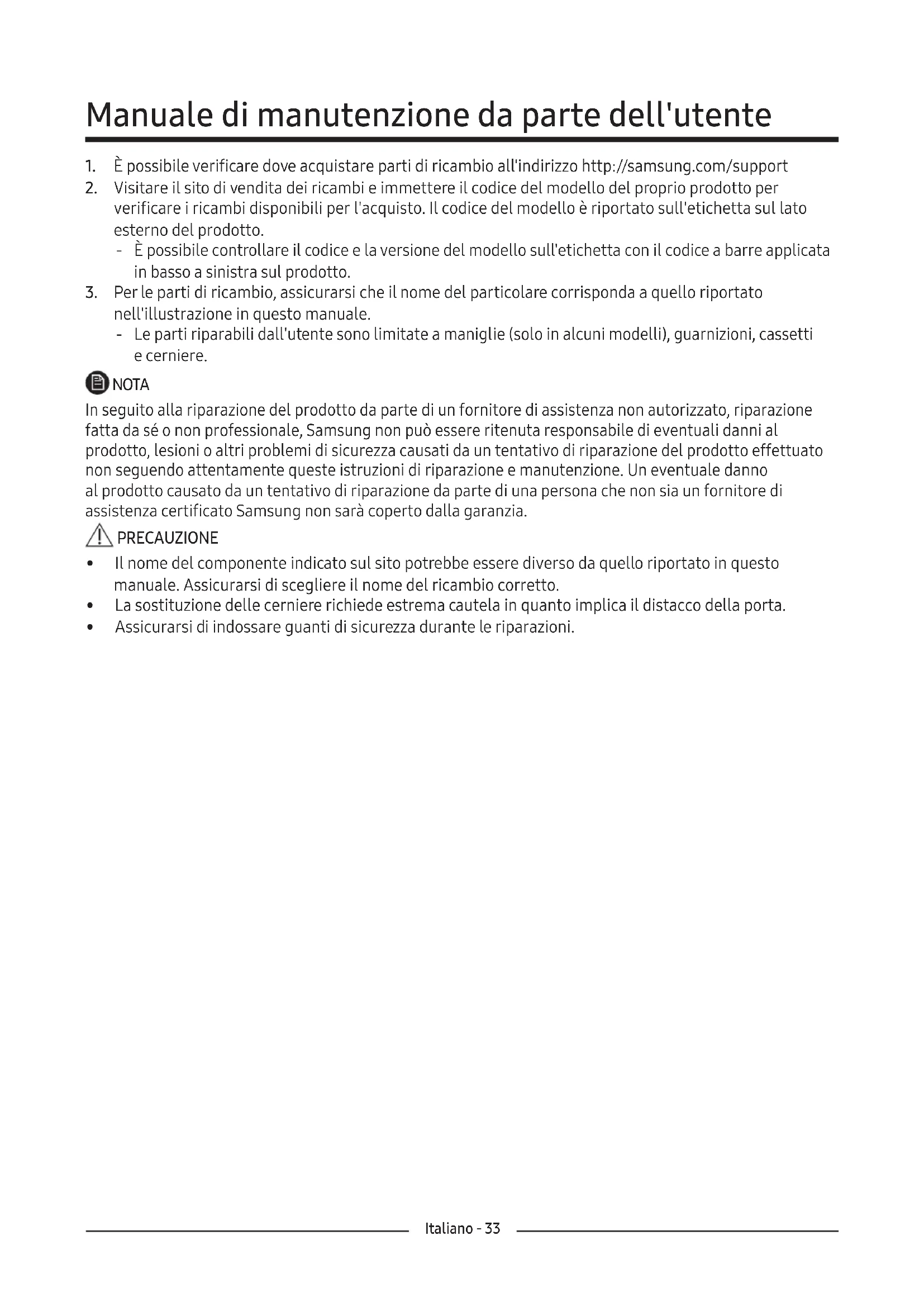 nell'illustrazione in questo manuale. ‐ Le parti riparabili dall'utente sono limitate a maniglie (solo in alcuni modelli), guarnizioni, cassetti ecerniere. NOTA In seguito alla riparazione del prodotto da parte di un fornitore di assistenza non autorizzato, riparazione fatta da sé o non professionale, Samsung non può essere ritenuta responsabile di eventuali danni al prodotto, lesioni o altri problemi di sicurezza causati da un tentativo di riparazione del prodotto effettuato non seguendo attentamente queste istruzioni di riparazione e manutenzione. Uneventuale danno al prodotto causato da un tentativo di riparazione da parte di una persona che non sia un fornitore di assistenza certificato Samsung non sarà coperto dalla garanzia. PRECAUZIONE