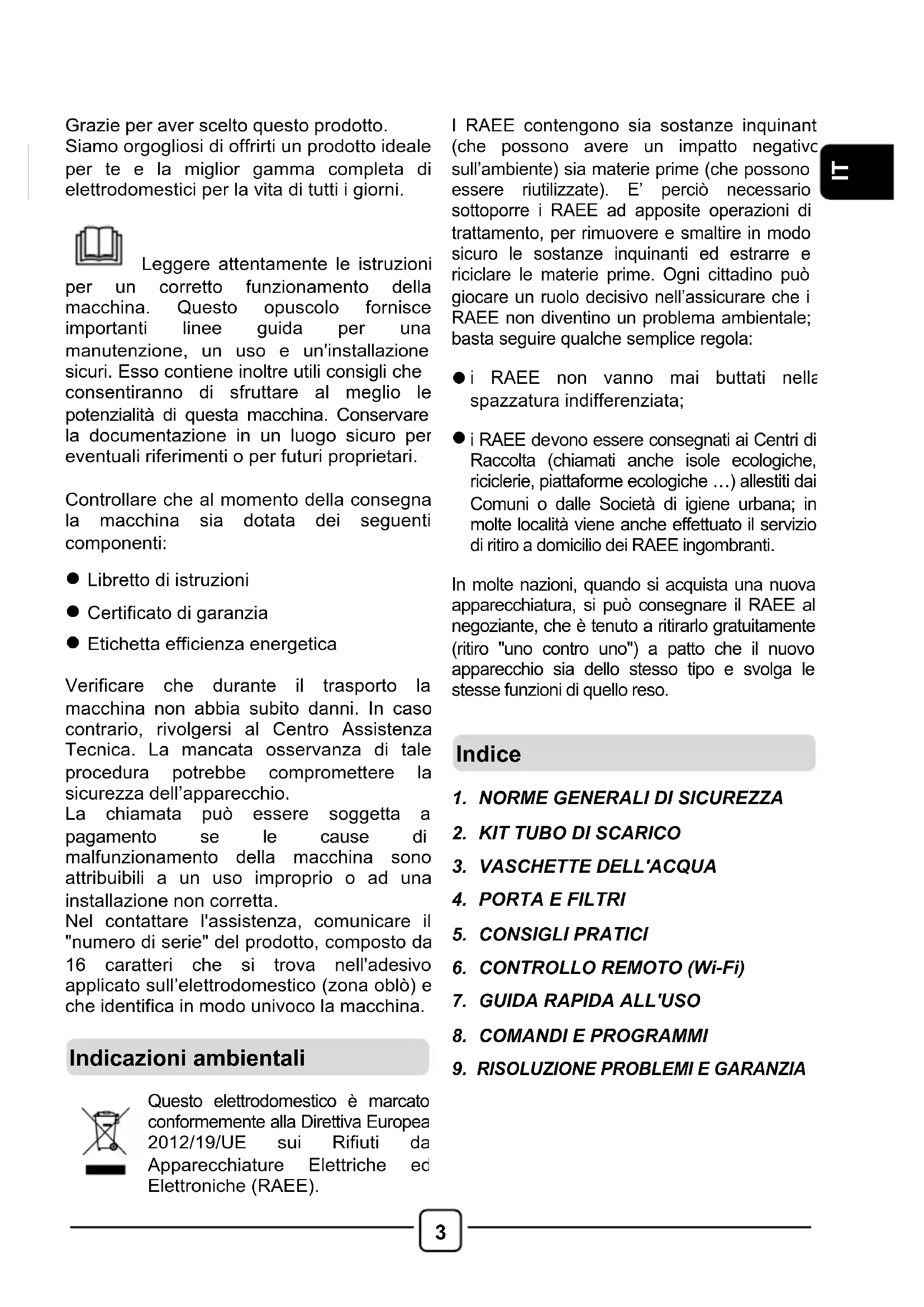 Leggere attentamente le istruzioni per un corretto funzionamento della macchina. Questo opuscolo fornisce importanti linee guida per una manutenzione, un uso e un'installazione sicuri. Esso contiene inoltre utili consigli che consentiranno di sfruttare al meglio le potenzialità di questa macchina. Conservare la documentazione in un luogo sicuro per eventuali riferimenti o per futuri proprietari.