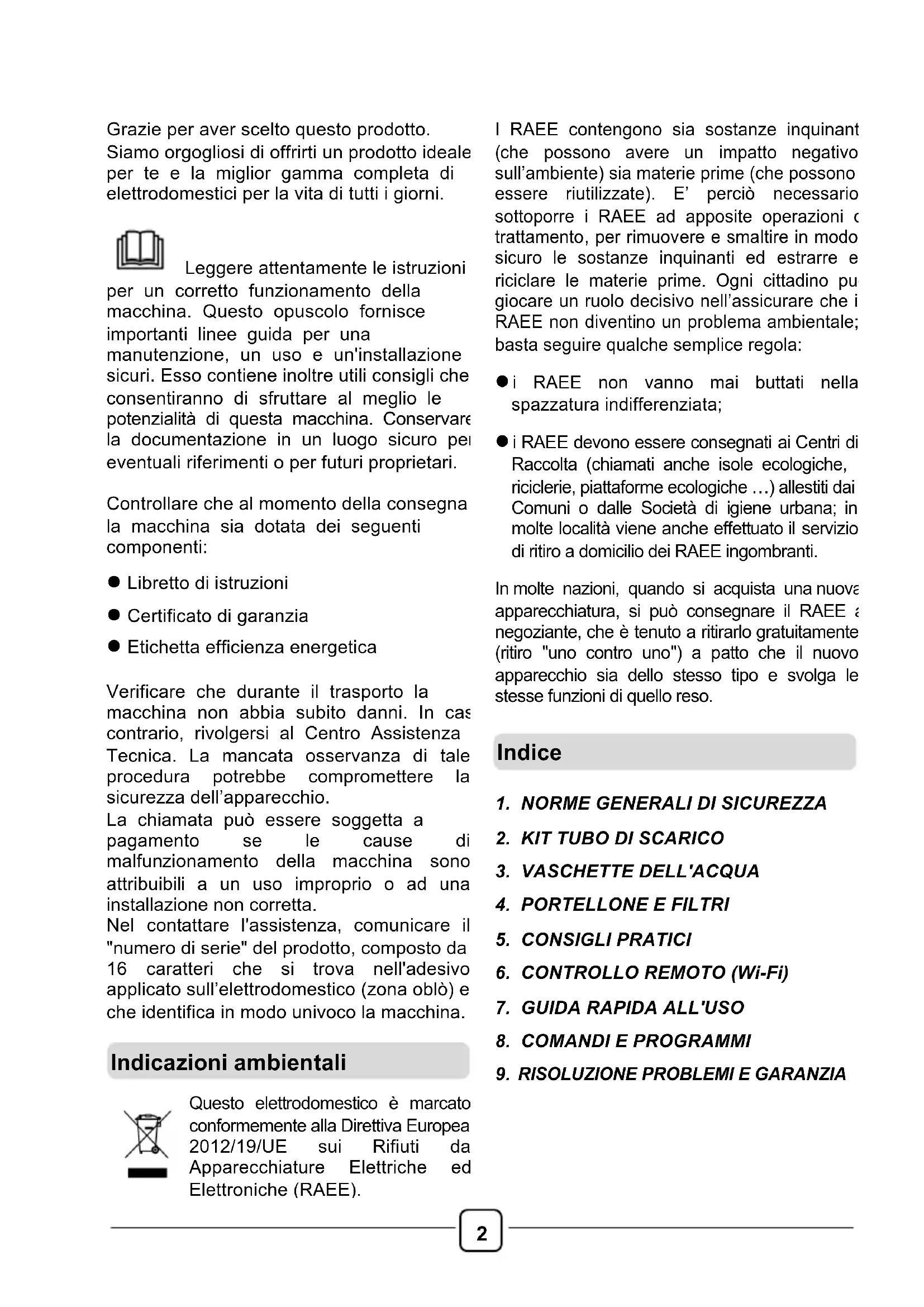 Grazie per aver scelto questo prodotto. Siamo orgogliosi di offrirti un prodotto ideale per te e la miglior gamma completa di elettrodomestici per la vita di tutti i giorni. Leggere attentamente le istruzioni per un corretto funzionamento della macchina. Questo opuscolo fornisce importanti linee guida per una manutenzione, un uso e un'installazione sicuri. Esso contiene inoltre utili consigli che consentiranno di sfruttare al meglio le potenzialità di questa macchina. Conservare la documentazione in un luogo sicuro per eventuali riferimenti o per futuri proprietari. Controllare che al momento della consegna la macchina sia dotata dei seguenti componenti: ! Libretto di istruzioni ! Certificato di garanzia ! Etichetta efficienza energetica Verificare che durante il trasporto la macchina non abbia subito danni. In caso contrario, rivolgersi al Centro Assistenza Tecnica. La mancata osservanza di tale procedura potrebbe compromettere la sicurezza dell’apparecchio. La chiamata può essere soggetta a pagamento se le cause di malfunzionamento della macchina sono attribuibili a un uso improprio o ad una installazione non corretta. Nel contattare l'assistenza, comunicare il "numero di serie" del prodotto, composto da 16 caratteri che si trova nell'adesivo applicato sull’elettrodomestico (zona oblò) e che identifica in modo univoco la macchina.