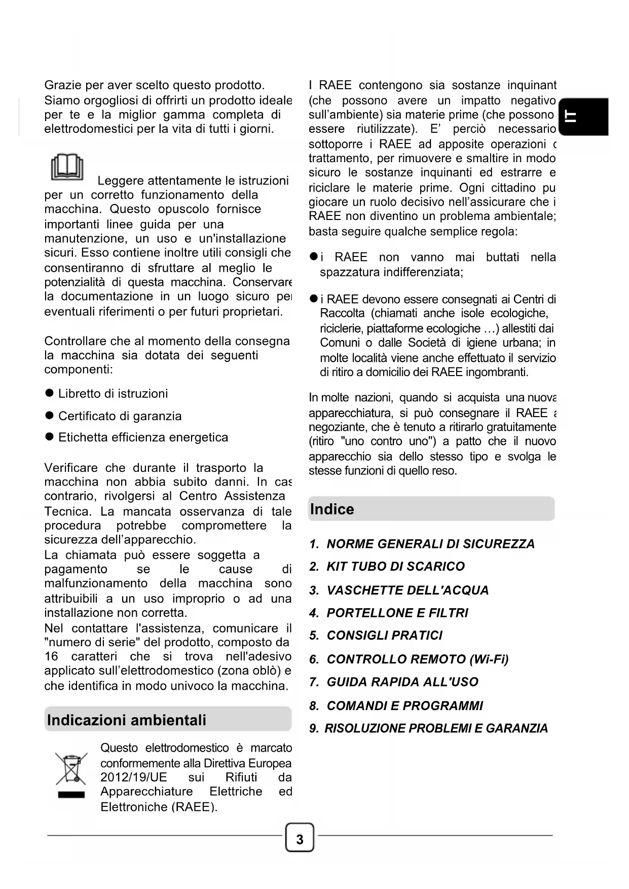 Grazie per aver scelto questo prodotto. Siamo orgogliosi di offrirti un prodotto ideale per te e la miglior gamma completa di elettrodomestici per la vita di tutti i giorni. Leggere attentamente le istruzioni per un corretto funzionamento della macchina. Questo opuscolo fornisce importanti linee guida per una manutenzione, un uso e un'installazione sicuri. Esso contiene inoltre utili consigli che consentiranno di sfruttare al meglio le potenzialità di questa macchina. Conservare la documentazione in un luogo sicuro per eventuali riferimenti o per futuri proprietari. Controllare che al momento della consegna la macchina sia dotata dei seguenti componenti: ! Libretto di istruzioni ! Certificato di garanzia ! Etichetta efficienza energetica Verificare che durante il trasporto la macchina non abbia subito danni. In caso contrario, rivolgersi al Centro Assistenza Tecnica. La mancata osservanza di tale procedura potrebbe compromettere la sicurezza dell’apparecchio. La chiamata può essere soggetta a pagamento se le cause di malfunzionamento della macchina sono attribuibili a un uso improprio o ad una installazione non corretta. Nel contattare l'assistenza, comunicare il "numero di serie" del prodotto, composto da 16 caratteri che si trova nell'adesivo applicato sull’elettrodomestico (zona oblò) e che identifica in modo univoco la macchina.