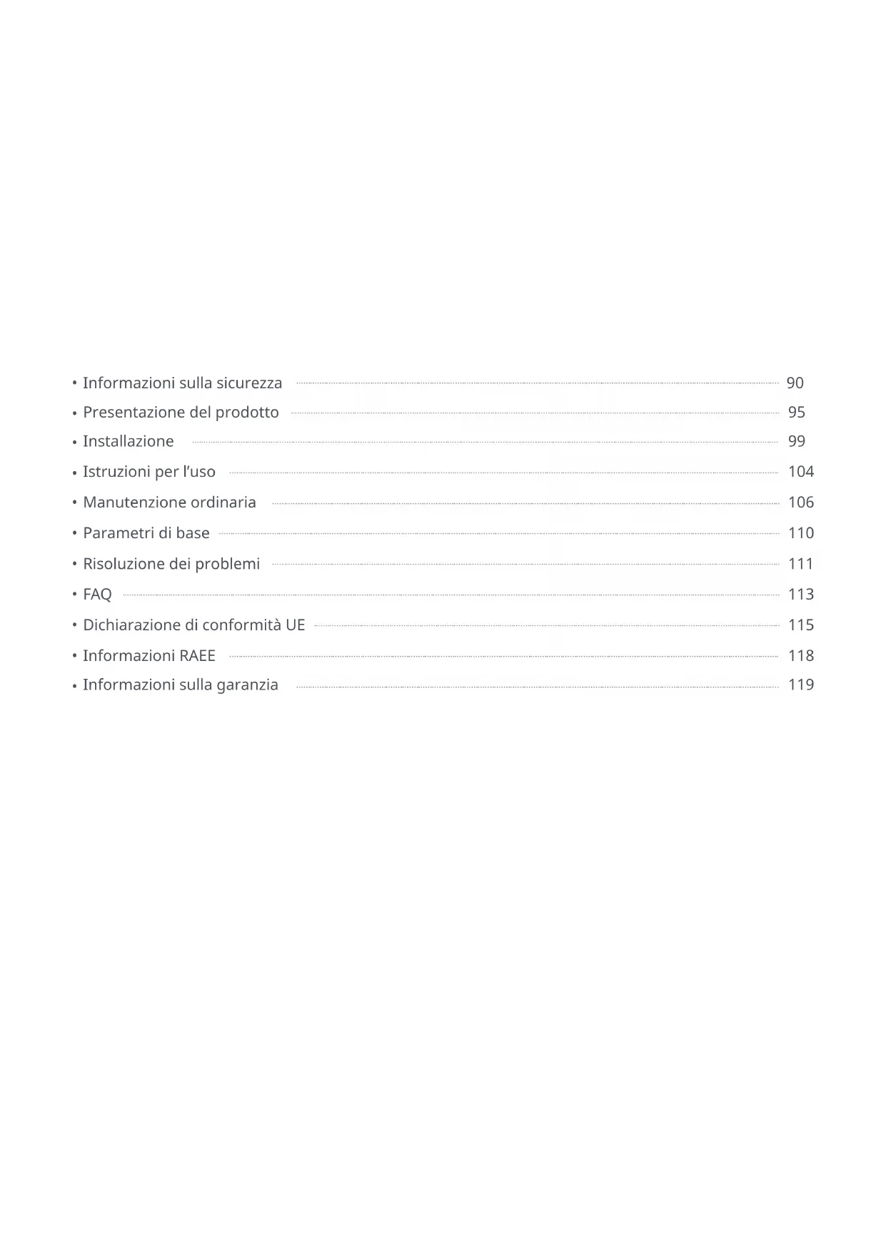 Documentazione tecnica per la valutazione di prodoi elerici ed eleronici in riferimento alla restrizione di sostanze pericolose. Direiva RoHS 2011/65/UE EN50581:2012 Persona responsabile della dichiarazione: Nome in stampatello: Rui.Shen Posizione/Titolo: Direore della qualità Firma: Data di rilascio:9 marzo2020 Luogo di rilascio: Floor 6, Suite 6016, 6017, 6018, Building C, Kangjian Baosheng Plaza, N. 8 Heiquan Road, Haidian District, Beijing, Repubblica Popolare Cinese Dichiarazione di conformità UE Informazioni RAEE Smaltimento correo di questo prodoo. Questo marchio indica che questo prodoo non deve essere smaltito con altri rifiuti domestici in tua l’UE. Per evitare possibili danni all’ambiente o alla salute umana derivanti dallo smaltimento incontrollato dei rifiuti, riciclarlo responsabilmente per promuovere il riutilizzo sostenibile delle risorse materiali. Per restituire il dispositivo utilizzato, fare uso dei sistemi di restituzione e raccolta o contaare il rivenditore presso il quale è stato acquistato il prodoo. Questi individui sono responsabili del riciclaggio sicuro per l’ambiente. 118Informazioni sulla garanzia Informazioni sulla garanzia Il periodo di garanzia dipende dalle leggi applicabili nel paese in cui viene venduto il prodoo e la garanzia è a carico del venditore. La garanzia copre solo difei di materiale o lavorazione. Le riparazioni in garanzia possono essere eseguite solo da un centro di assistenza autorizzato. Quando si presenta un reclamo in garanzia, è necessario presentare la faura di acquisto originale (con la data di acquisto). La garanzia non si applica in caso di: Normale usura Uso errato, ad es. sovraccarico dell’apparecchiatura, uso di accessori non approvati uso di forza, danni causati da influssi esterni, danni causati dall’inosservanza del manuale dell’utente, ad es. il collegamento a una rete di alimentazione non idonea o la mancata osservanza delle istruzioni di installazione Apparecchiature parzialmente o completamente smantellate. Sicurezza laser Il sensore di distanza laser di questo prodoo soddisfa gli standard per i prodoi laser di Classe I come per norma CEI 60825-1:2014 e non genererà radiazioni laser pericolose. Información sobre seguridad Presentación del producto Instalación Instrucciones de uso Mantenimiento rutinario Parámetros básicos Preguntas frecuentes Declaración de conformidad de la UE Información sobre la Directiva de Residuos de Aparatos Eléctricos y Electrónicos (WEEE, por sus siglas en inglés) Información sobre la garantía Solución de problemas
