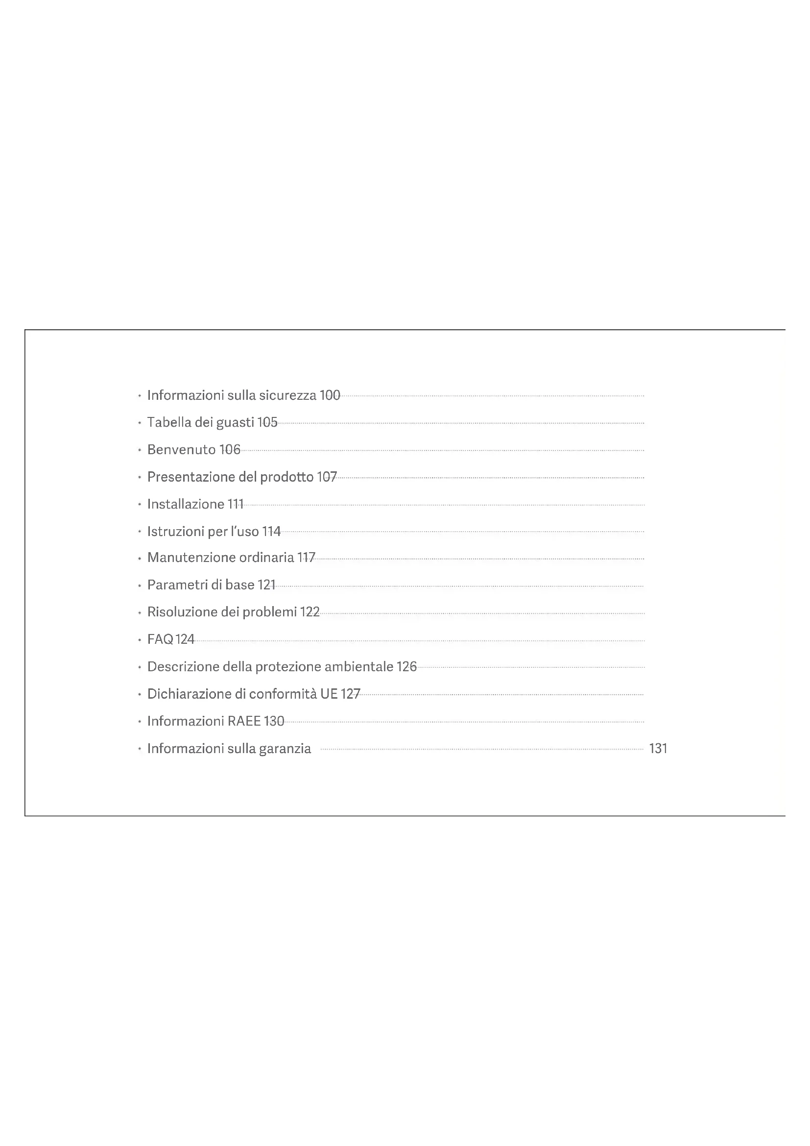 Garantieinformationen Der Verkäufer gewährt eine Garantie gemäß den Gesetzen des Landes, in dem sich der Wohnsitz des Kunden befindet, von mindestens 1Jahr, beginnend ab dem Datum des Verkaufs des Geräts an den Endbenutzer. Die Garantie deckt nur Material- und Verarbeitungsfehler ab. Reparaturen unter Garantie dürfen nur von einem autorisierten Servicecenter durchgeführt werden. Bei Inanspruchnahme der Garantie muss die Originalrechnung (mit Kaufdatum) eingereicht werden. Die Garantie gilt nicht bei: normalem Verschleiß, unsachgemäßer Verwendung, z.B. Überladung des Geräts, Verwendung nicht zugelassener Zubehörteile, Gewaltanwendung, durch äußere Einflüsse verursachten Schäden, durch Nichtbeachtung des Benutzerhandbuchs verursachten Schäden, z.B. Anschluss an eine ungeeignete Stromversorgung, oder Nichteinhaltung der Auauanleitung, teilweise oder vollständig demontierten Geräten. Lasersicherheit Der Laser-Distanzsensor dieses Produkts erfüllt die Normen für Laserprodukte der KlasseI in IEC60825-1:2014 und generiert keine gefährliche Laserstrahlung.Informazioni sulla sicurezza 100 Tabella dei guasti 105 Benvenuto 106 Presentazione del prodoo 107 Installazione 111 Istruzioni per l’uso 114 Manutenzione ordinaria 117 Parametri di base 121 Risoluzione dei problemi 122 FAQ 124 Dichiarazione di conformità UE 127 Descrizione della protezione ambientale 126 Informazioni RAEE 130 Informazioni sulla garanzia 131Informazioni sulla sicurezza Limitazioni Questo prodoo è stato progeato esclusivamente per la pulizia di pavimenti interni, non utilizzare all'esterno (ad esempio, una terrazza aperta), su superfici diverse dal pavimento (ad esempio, un divano) oppure in ambienti commerciali e industriali. Non utilizzare il prodoo su superfici elevate prive di barriere quali, ad esempio, il pavimento di un soppalco, una terrazza aperta o su dei mobili. Non utilizzare il prodoo quando la temperatura ambiente è superiore a 40 °C (104 °F) o inferiore a 4 °C (39 °F), oppure se sul pavimento sono presenti sostanze liquide o appiccicose. Prima di usare il prodoo, sollevare tui i fili da terra o spostarli di lato onde evitare che vengano trascinati dall'aspirapolvere. Per evitare che il prodo o si blocchi e prevenire danni a ogge i di valore, rimuovere dal pavimento quelli leggeri (come le buste di plastica) e fragili (come i vasi) prima di avviare la pulizia. I bambini devono essere sorvegliati per assicurarsi che non interferiscano con il prodoo. 100Informazioni sulla sicurezza L'uso di que sto prodo o non è des tinat o a p ersone ( inclusi bambini) con r idoe capacità fisiche, sensoriali o mentali, o mancanza di esperienza e conoscenza, a meno che non siano state fornite istruzioni di supervisione in merito all'uso del prodoo stesso da parte di una persona responsabile della loro sicurezza (CB). Questo prodoo può essere utilizzato da bambini di età pari o superiore a 8 anni e persone con ridoe capacità fisiche, sensoriali o mentali o mancanza di es- perienza e conoscenza se hanno ricevuto supervisione o istruzioni in merito all'uso sicuro del prodoo e comprendono i pericoli connessi. I bambini non devono giocare con il prodoo. Le operazioni di pulizia e manutenzione da parte dell'utente non devono essere eseguite da bambini senza supervisione (UE). Tenere g li s tr umen ti di puli zia della spa z zola principa le f uor i dalla por t ata dei bambini. Non posizionare alcun oggeo (inclusi bambini e animali domestici) sul prodoo, indipendentemente dal fao che sia in funzione o meno. Tenere capelli, indumenti larghi, dita e tue le par ti del corpo lontani da aper ture e parti mobili. Non utilizzare il prodoo su oggei che bruciano (come mozziconi di sigaree). 101Informazioni sulla sicurezza Non utilizzare il prodoo su tappeti a pelo lungo (l'efficacia del prodoo risulta ridoa anche su tappeti di colore scuro). Non utilizzare il prodoo per pulire oggei duri o appuntiti (come rifiuti decorativi, vetro e chiodi). Non trasportare il prodoo usando il tappo dello scanner laser, il coperchio dell'unità principale o il paraurti. Il prodo o deve essere spento e la spina deve essere rimossa dalla presa ele rica prima di eseguire la pulizia o la manutenzione del prodoo. Non usare panni umidi o liquidi per pulire il prodoo. Non utilizzare il modulo di lavaggio su tappeti. Utilizzare il prodoo secondo il manuale. Qualsiasi perdita o danno causato da un uso improprio sarà responsabilità dell'utente. Questo prodoo contiene baerie sostituibili esclusivamente da personale esperto. 102Baeria e ricarica AVVERTIMENTO Informazioni sulla sicurezza Non caricare baerie non ricaricabili. Al fine di ricaricare la baeria, utilizzare esclusivamente l'unità di alimentazione rimovibile roborock CDZ10RR fornita con questo prodoo. Non smontare, riparare o modificare la baeria o la base di ricarica. Tenere la base di ricarica lontana da fonti di calore (come bocchee di aria calda). Non rimuovere né pulire i poli del caricabaerie con un panno umido o con le mani bagnate. La baeria deve essere rimossa prima di poter procedere con lo smaltimento del prodoo. Il prodoo deve essere scollegato dalla rete elerica quando si rimuove la baeria. Smaltire la baeria in sicurezza. Non smaltire le baerie dismesse. Consegnarle presso un ente di riciclaggio rifiuti autorizzato. 103Informazioni sulla sicurezza In caso di danni al cavo di alimentazione, interrompere immediatamente l'utilizzo. Il cavo deve essere sostituito dal produore, da un suo agente di assistenza o da personale qualificato per non incorrere in situazioni di pericolo. Assicurarsi che il prodoo sia spento prima della spedizione. Si consiglia di utilizzare l'imballo originale. Se si intende lasciare il prodoo inutilizzato per un lungo periodo di tempo, eseguire una ricarica completa e spegnerlo prima di riporlo in un luogo fresco e asciuo. Caricarlo almeno ogni tre mesi per evitare che la baeria si scarichi completamente. Per garantire il rispeo dei requisiti d