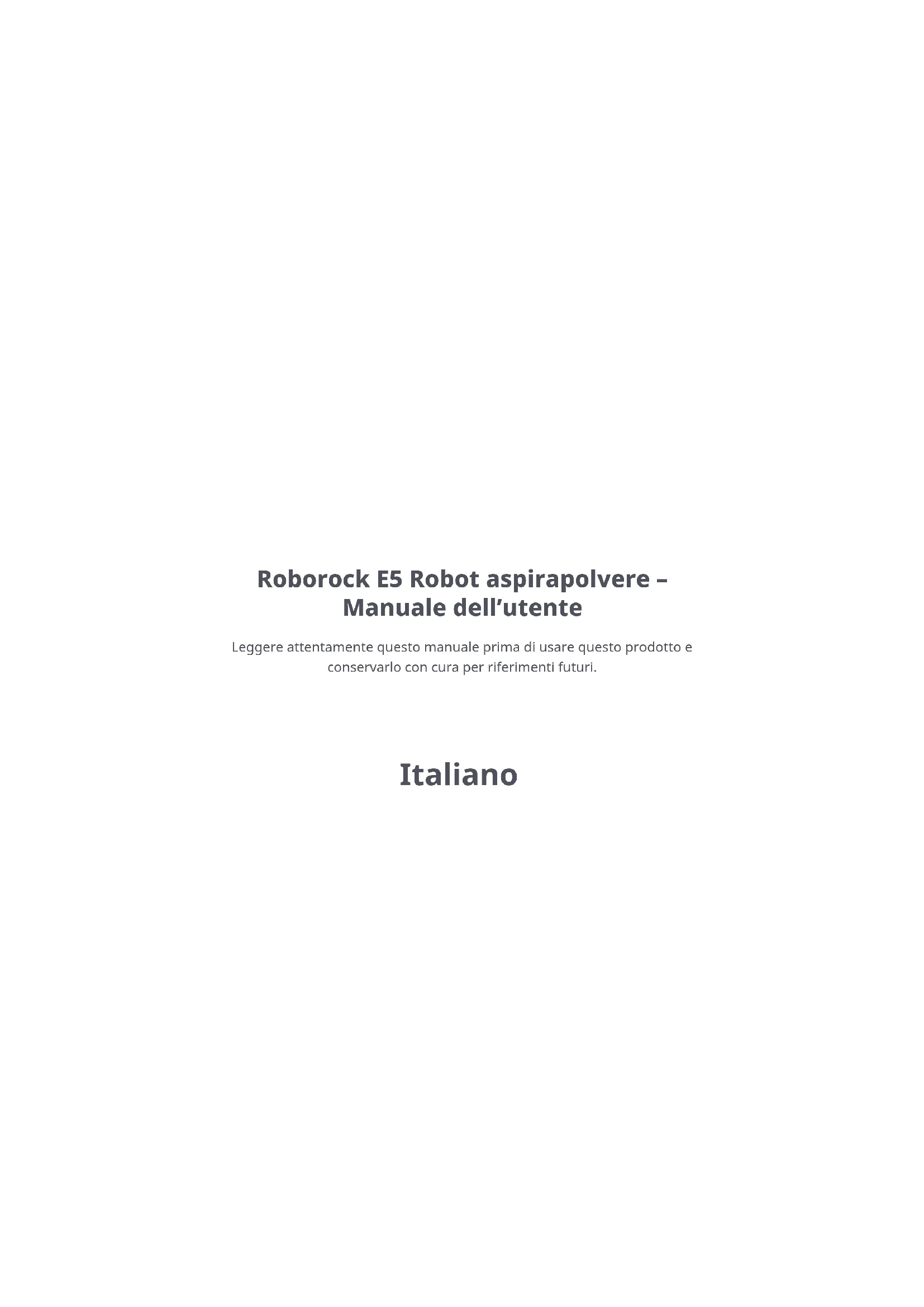 Teilweise oder vollständig demontierte Geräte.Leggere attentamente questo manuale prima di usare questo prodotto e conservarlo con cura per riferimenti futuri. Roborock E5 Robot aspirapolvere – Manuale dell’utente Italiano131 Informazioni sulla sicurezza 136 Risoluzione dei problemi per l’aspirapolvere Roborock 137 Presentazione del prodotto 143 Installazione 148 Istruzioni per l’uso 152 Manutenzione ordinaria 157 Parametri di base 158 Risoluzione dei problemi 161 FAQ 164 SpecichedelWiFi 165 Dichiarazione di conformità UE 170 Informazioni RAEE 171 Informazioni sulla garanzia Indice131 Limitazioni Informazioni sulla sicurezza