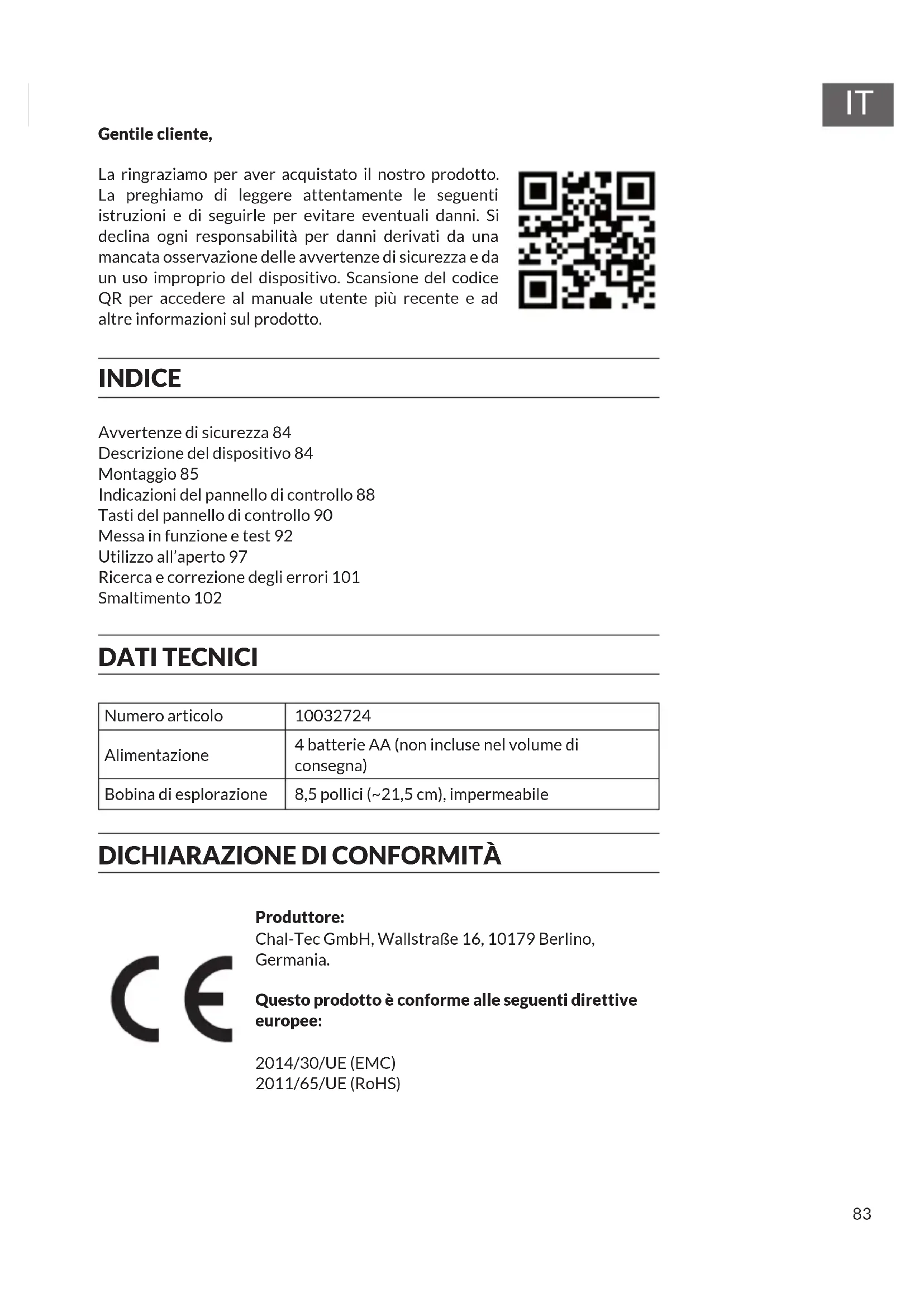 Produttore: Chal-Tec GmbH, Wallstraße 16, 10179 Berlino, Germania. Questo prodotto è conforme alle seguenti direttive europee: 2014/30/UE (EMC) 2011/65/UE (RoHS)84