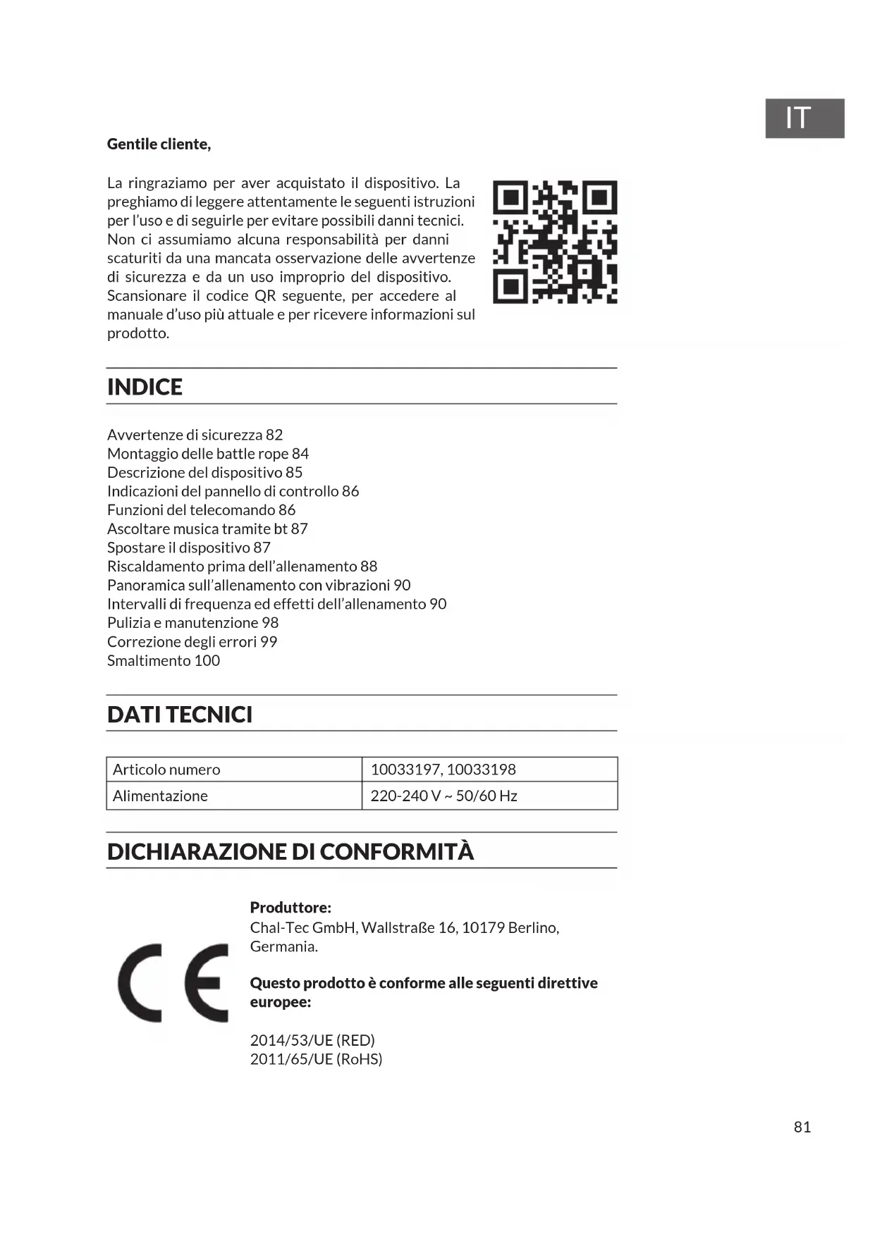 Gentile cliente, La ringraziamo per aver acquistato il dispositivo. La preghiamo di leggere attentamente le seguenti istruzioni per l’uso e di seguirle per evitare possibili danni tecnici. Non ci assumiamo alcuna responsabilità per danni scaturiti da una mancata osservazione delle avvertenze di sicurezza e da un uso improprio del dispositivo. Scansionare il codice QR seguente, per accedere al manuale d’uso più attuale e per ricevere informazioni sul prodotto. INDICE Avvertenze di sicurezza 82 Montaggio delle battle rope 84 Descrizione del dispositivo 85 Indicazioni del pannello di controllo 86 Funzioni del telecomando 86 Ascoltare musica tramite bt 87 Spostare il dispositivo 87 Riscaldamento prima dell’allenamento 88 Panoramica sull’allenamento con vibrazioni 90 Intervalli di frequenza ed effetti dell’allenamento 90 Pulizia e manutenzione 98 Correzione degli errori 99 Smaltimento 100 DATI TECNICI Articolo numero 10033197, 10033198 Alimentazione 220-240 V ~ 50/60 Hz