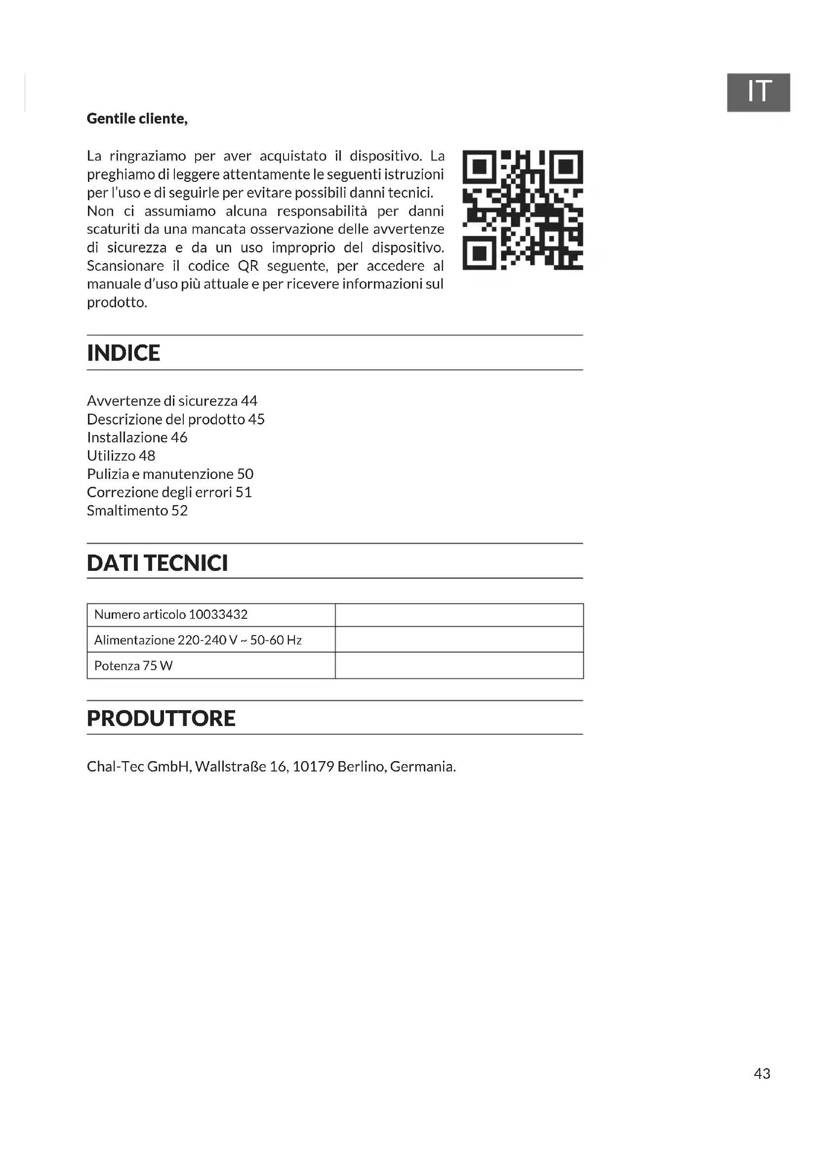 Gentile cliente, La ringraziamo per aver acquistato il dispositivo. La preghiamo di leggere attentamente le seguenti istruzioni per l’uso e di seguirle per evitare possibili danni tecnici. Non ci assumiamo alcuna responsabilità per danni scaturiti da una mancata osservazione delle avvertenze di sicurezza e da un uso improprio del dispositivo. Scansionare il codice QR seguente, per accedere al manuale d’uso più attuale e per ricevere informazioni sul prodotto. INDICE Avvertenze di sicurezza 44 Descrizione del prodotto 45 Installazione 46 Utilizzo 48 Pulizia e manutenzione 50 Correzione degli errori 51 Smaltimento 52 DATI TECNICI Numero articolo 10033432 Alimentazione 220-240 V ~ 50-60 Hz Potenza 75 W PRODUTTORE Chal-Tec GmbH, Wallstraße 16, 10179 Berlino, Germania.44