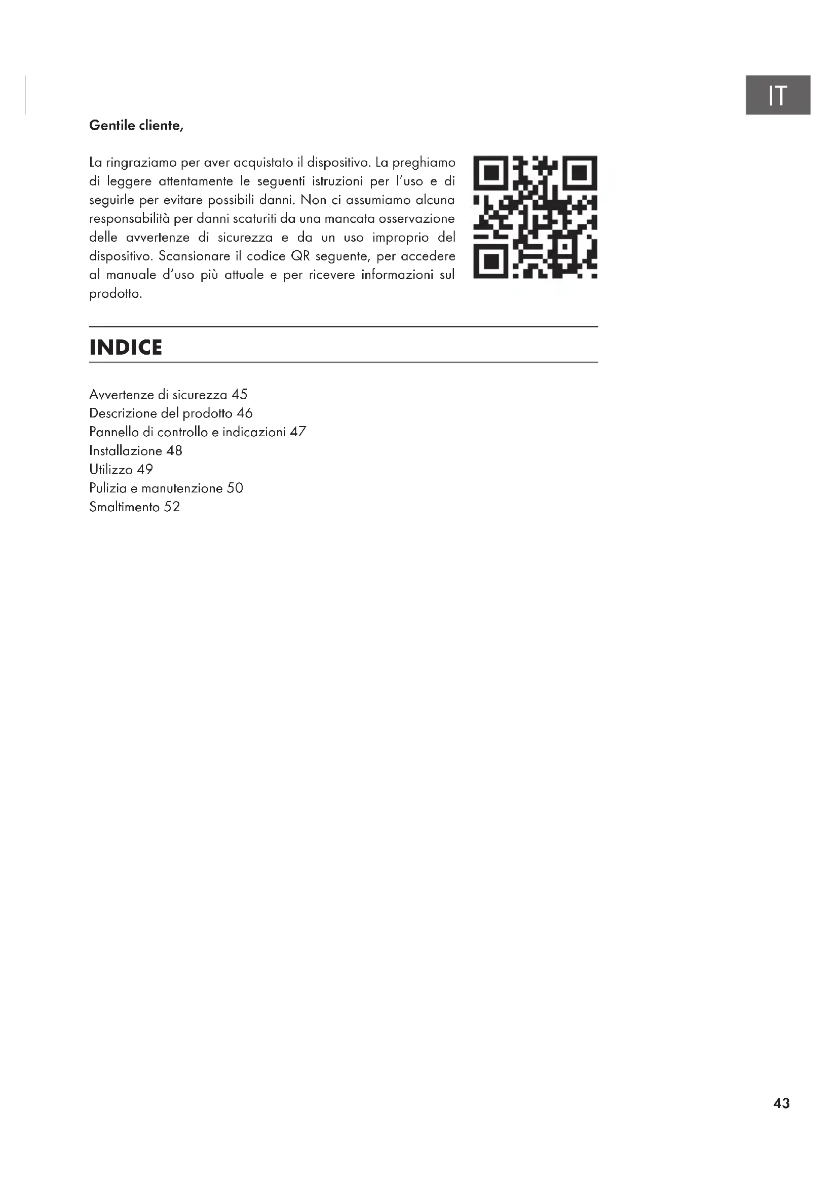 Gentile cliente, La ringraziamo per aver acquistato il dispositivo. La preghiamo di leggere attentamente le seguenti istruzioni per l’uso e di seguirle per evitare possibili danni. Non ci assumiamo alcuna responsabilità per danni scaturiti da una mancata osservazione delle avvertenze di sicurezza e da un uso improprio del dispositivo. Scansionare il codice QR seguente, per accedere al manuale d’uso più attuale e per ricevere informazioni sul prodotto. INDICE Avvertenze di sicurezza45 Descrizione del prodotto46 Pannello di controllo e indicazioni47 Installazione48 Utilizzo49 Pulizia e manutenzione50 Smaltimento5244