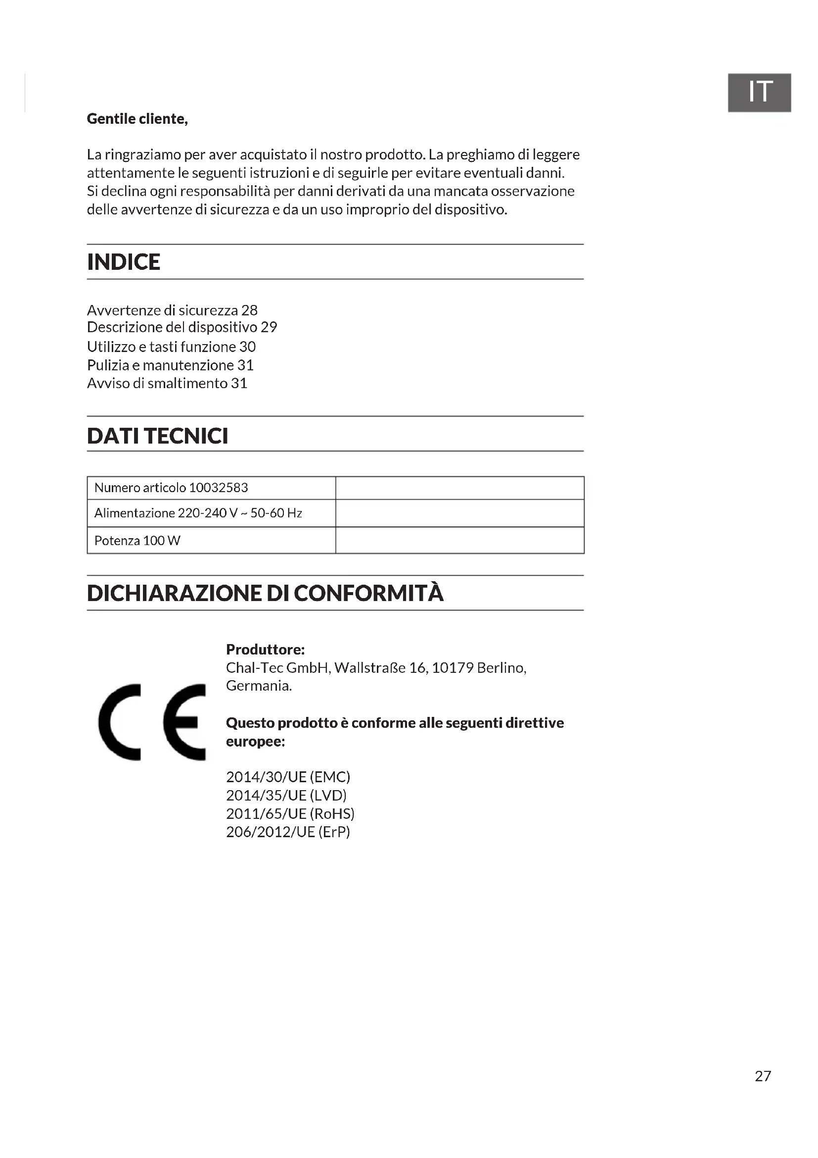 Produttore: Chal-Tec GmbH, Wallstraße 16, 10179 Berlino, Germania. Questo prodotto è conforme alle seguenti direttive europee: 2014/30/UE (EMC) 2014/35/UE (LVD) 2011/65/UE (RoHS) 206/2012/UE (ErP)28
