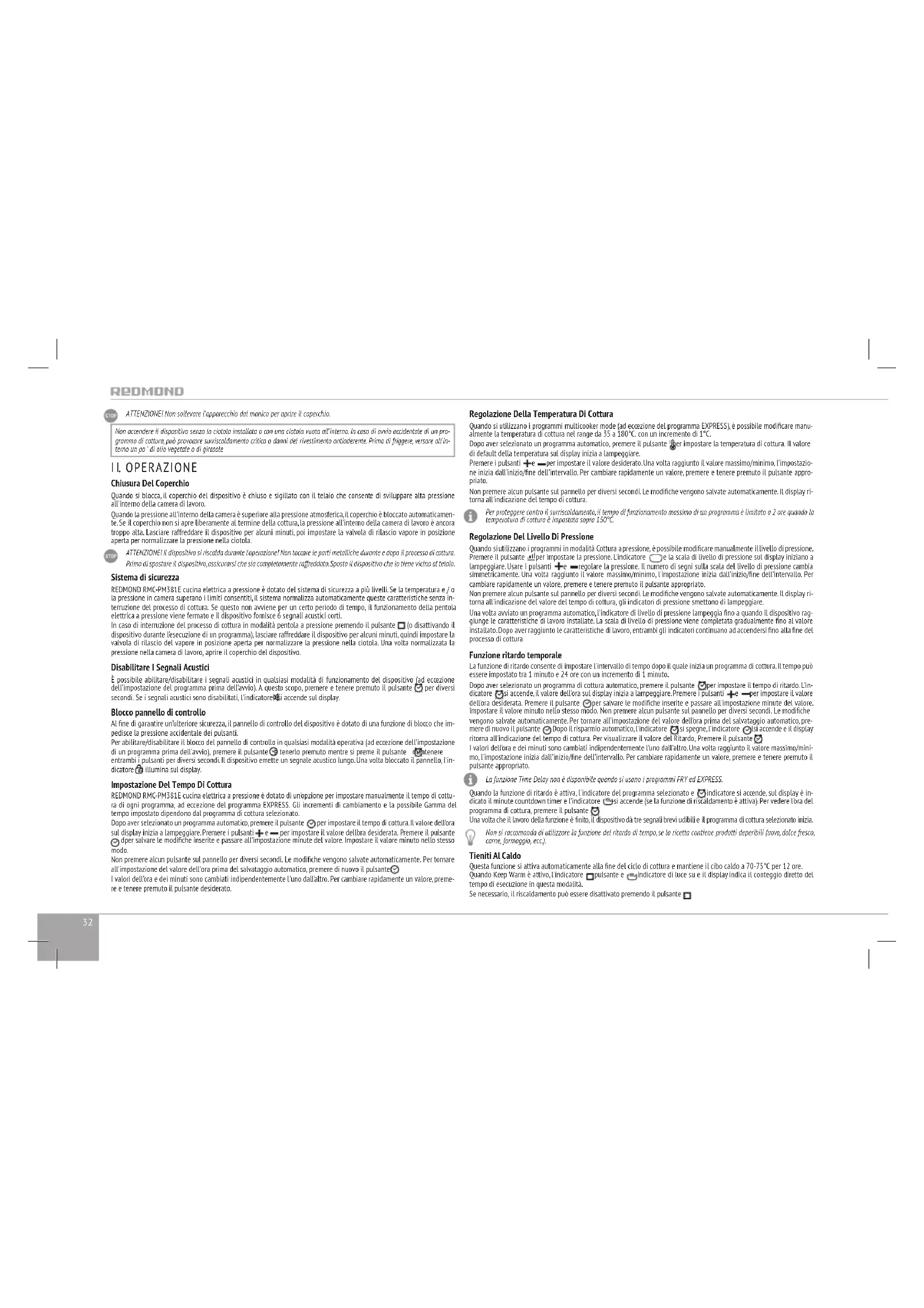 Chiusura Del Coperchio Quando si blocca, il coperchio del dispositivo è chiuso e sigillato con il telaio che consente di sviluppare alta pressione all'interno della camera di lavoro. Quando la pressione all'interno della camera è superiore alla pressione atmosferica, il coperchio è bloccato automaticamen- te. Se il coperchio non si apre liberamente al termine della cottura, la pressione all'interno della camera di lavoro è ancora troppo alta. Lasciare raffreddare il dispositivo per alcuni minuti, poi impostare la valvola di rilascio vapore in posizione aperta per normalizzare la pressione nella ciotola. ATTENZIONE! Il dispositivo si riscalda durante l'operazione! Non toccare le parti metalliche durante e dopo il processo di cottura. Prima di spostare il dispositivo, assicurarsi che sia completamente raffreddato. Sposta il dispositivo che lo tiene vicino al telaio. Sistema di sicurezza REDMOND RMC-PM381E cucina elettrica a pressione è dotato del sistema di sicurezza a più livelli. Se la temperatura e / o la pressione in camera superano i limiti consentiti, il sistema normalizza automaticamente queste caratteristiche senza in- terruzione del processo di cottura. Se questo non avviene per un certo periodo di tempo, il funzionamento della pentola elettrica a pressione viene fermato e il dispositivo fornisce 6 segnali acustici corti. In caso di interruzione del processo di cottura in modalità pentola a pressione premendo il pulsante (o disattivando il dispositivo durante l'esecuzione di un programma), lasciare raffreddare il dispositivo per alcuni minuti, quindi impostare la valvola di rilascio del vapore in posizione aperta per normalizzare la pressione nella ciotola. Una volta normalizzata la pressione nella camera di lavoro, aprire il coperchio del dispositivo. Disabilitare I Segnali Acustici È possibile abilitare/disabilitare i segnali acustici in qualsiasi modalità di funzionamento del dispositivo (ad eccezione dell'impostazione del programma prima dell'avvio). A questo scopo, premere e tenere premuto il pulsante per diversi secondi. Se i segnali acustici sono disabilitati, l'indicatore si accende sul display. Blocco pannello di controllo Al ne di garantire un'ulteriore sicurezza, il pannello di controllo del dispositivo è dotato di una funzione di blocco che im- pedisce la pressione accidentale dei pulsanti. Per abilitare/disabilitare il blocco del pannello di controllo in qualsiasi modalità operativa (ad eccezione dell'impostazione di un programma prima dell'avvio), premere il pulsante e tenerlo premuto mentre si preme il pulsante mantenere entrambi i pulsanti per diversi secondi. Il dispositivo emette un segnale acustico lungo. Una volta bloccato il pannello, l'in- dicatore si illumina sul display. Impostazione Del Tempo Di Cottura REDMOND RMC-PM381E cucina elettrica a pressione è dotato di un'opzione per impostare manualmente il tempo di cottu- ra di ogni programma, ad eccezione del programma EXPRESS. Gli incrementi di cambiamento e la possibile Gamma del tempo impostato dipendono dal programma di cottura selezionato. Dopo aver selezionato un programma automatico, premere il pulsante per impostare il tempo di cottura. Il valore dell'ora sul display inizia a lampeggiare. Premere i pulsanti e per impostare il valore dell'ora desiderata. Premere il pulsante dper salvare le modiche inserite e passare all'impostazione minute del valore. Impostare il valore minuto nello stesso modo. Non premere alcun pulsante sul pannello per diversi secondi. Le modiche vengono salvate automaticamente. Per tornare all'impostazione del valore dell'ora prima del salvataggio automatico, premere di nuovo il pulsante . I valori dell'ora e dei minuti sono cambiati indipendentemente l'uno dall'altro. Per cambiare rapidamente un valore, preme- re e tenere premuto il pulsante desiderato. Regolazione Della Temperatura Di Cottura Quando si utilizzano i programmi multicooker mode (ad eccezione del programma EXPRESS), è possibile modicare manu- almente la temperatura di cottura nel range da 35 a 180°С. con un incremento di 1°С. Dopo aver selezionato un programma automatico, premere il pulsante per impostare la temperatura di cottura. Il valore di default della temperatura sul display inizia a lampeggiare. Premere i pulsanti e per impostare il valore desiderato. Una volta raggiunto il valore massimo/minimo, l'impostazio- ne inizia dall'inizio/ne dell'intervallo. Per cambiare rapidamente un valore, premere e tenere premuto il pulsante appro- priato. Non premere alcun pulsante sul pannello per diversi secondi. Le modiche vengono salvate automaticamente. Il display ri- torna all'indicazione del tempo di cottura. Per proteggere contro il surriscaldamento, il tempo di funzionamento massimo di un programma è limitato a 2 ore quando la temperatura di cottura è impostata sopra 150°С. Regolazione Del Livello Di Pressione Quando si utilizzano i programmi in modalità Cottura a pressione, è possibile modicare manualmente il livello di pressione. Premere il pulsante per impostare la pressione. L'indicatore e la scala di livello di pressione sul display iniziano a lampeggiare. Usare i pulsanti e regolare la pressione. Il numero di segni sulla scala del livello di pressione cambia simmetricamente. Una volta raggiunto il valore massimo/minimo, l'impostazione inizia dall'inizio/ne dell'intervallo. Per cambiare rapidamente un valore, premere e tenere premuto il pulsante appropriato. Non premere alcun pulsante sul pannello per diversi secondi. Le modiche vengono salvate automaticamente. Il display ri- torna all'indicazione del valore del tempo di cottura, gli indicatori di pressione smettono di lampeggiare. Una volta avviato un programma automatico, l'indicatore di livello di pressione lampeggia no a quando il dispositivo rag- giunge le caratteristiche di lavoro installate. La scala di livello di pressione viene completata gradualmente no al valore installato. Dopo aver raggiunto le caratteristiche di lavoro, entram
