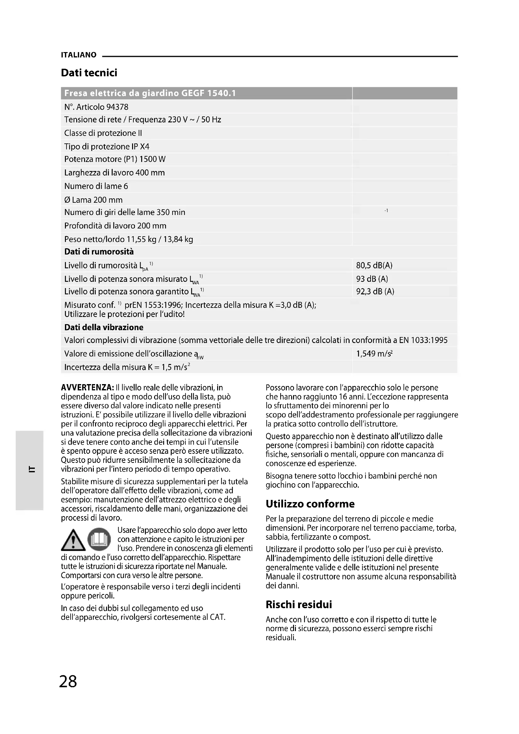 AVVERTENZA: Il livello reale delle vibrazioni, in dipendenza al tipo e modo dell‘uso della lista, può essere diverso dal valore indicato nelle presenti istruzioni. E‘ possibile utilizzare il livello delle vibrazioni per il confronto reciproco degli apparecchi elettrici. Per una valutazione precisa della sollecitazione davibrazioni si deve tenere conto anche dei tempi incui l‘utensile è spento oppure è acceso senza peròessere utilizzato. Questo può ridurre sensibilmentela sollecitazione da vibrazioni per l‘intero periododi tempo operativo. Stabilite misure di sicurezza supplementari per la tutela dell’operatore dall’eetto delle vibrazioni, come ad esempio: manutenzione dell’attrezzo elettrico e degli accessori, riscaldamento delle mani, organizzazione dei processi di lavoro. Usare l‘apparecchio solo dopo aver letto con attenzione e capito le istruzioni per l‘uso. Prendere in conoscenza gli elementi di comando e l’uso corretto dell’apparecchio. Rispettare tutte le istruzioni di sicurezza riportate nel Manuale. Comportarsi con cura verso le altre persone. L‘operatore è responsabile verso i terzi degli incidenti oppure pericoli. In caso dei dubbi sul collegamento ed uso dell‘apparecchio, rivolgersi cortesemente al CAT. Possono lavorare con l‘apparecchiosolo le persone che hannoraggiunto 16 anni. L’eccezionerappresenta lo sfruttamento deiminorenni per lo scopodell’addestramento professionaleper raggiungere la pratica sottocontrollo dell‘istruttore. Questo apparecchio non è destinato all’utilizzo dalle persone (compresi i bambini) con ridotte capacità siche, sensoriali o mentali, oppure con mancanza di conoscenze ed esperienze. Bisogna tenere sotto l‘occhio i bambini perché non giochino con l‘apparecchio. Utilizzo conforme Per la preparazione del terreno di piccole e medie dimensioni. Per incorporare nel terreno pacciame, torba, sabbia, fertilizzante o compost. Utilizzare il prodotto solo per l’uso per cui è previsto. All‘inadempimento delle istituzioni delle direttive generalmente valide e delle istituzioni nel presente Manuale il costruttore non assume alcuna responsabilità dei danni. Rischi residui Anche con l‘uso corretto e con il rispetto di tutte le norme di sicurezza, possono esserci sempre rischi residuali. ITALIANO IT28 29