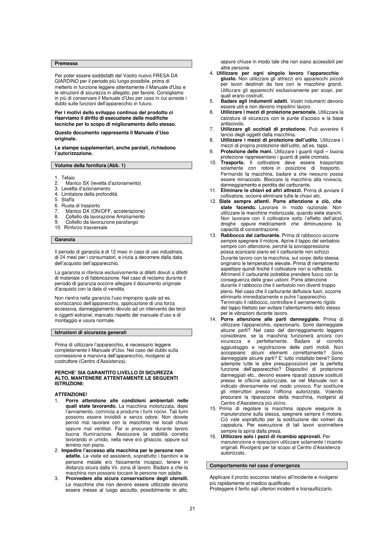 20Premessa Per poter essere soddisfatti del Vostro nuovo FRESA DA GIARDINO per il periodo più lungo possibile, prima di metterlo in funzione leggere attentamente il Manuale d'Uso e le istruzioni di sicurezza in allegato, per favore. Consigliamo in più di conservare il Manuale d’Uso per caso in cui avreste i dubbi sulle funzioni dell’apparecchio in futuro. Per i motivi dello sviluppo continuo del prodotto ci riserviamo il diritto di esecuzione delle modifiche tecniche per lo scopo di miglioramento dello stesso. Questo documento rappresenta il Manuale d’Uso originale. Le stampe supplementari, anche parziali, richiedono l’autorizzazione. Volume della fornitura (Abb. 1)