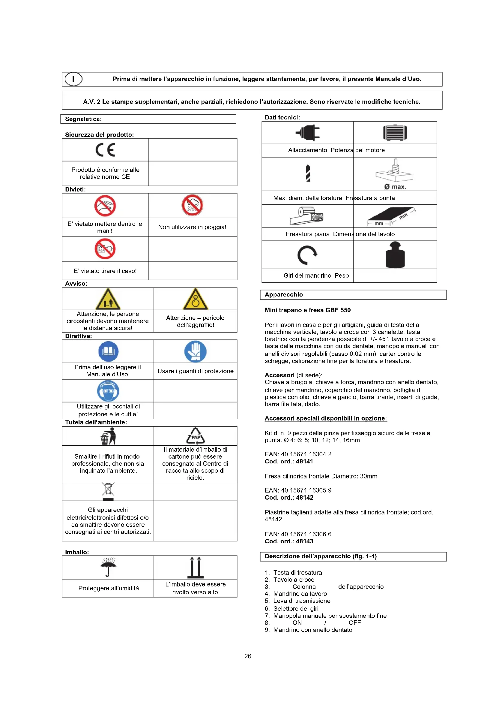Dati tecnici: Allacciamento Potenza del motore Max. diam. della foratura Fresatura a punta Fresatura piana Dimensione del tavolo Giri del mandrino Peso Apparecchio Mini trapano e fresa GBF 550 Per i lavori in casa e per gli artigiani, guida di testa della macchina verticale, tavolo a croce con 3 canalette, testa foratrice con la pendenza possibile di +/- 45°, tavolo a croce e testa della macchina con guida dentata, manopole manuali con anelli divisori regolabili (passo 0,02 mm), carter contro le schegge, calibrazione fine per la foratura e fresatura. Accessori (di serie): Chiave a brugola, chiave a forca, mandrino con anello dentato, chiave per mandrino, coperchio del mandrino, bottiglia di plastica con olio, chiave a gancio, barra tirante, inserti di guida, barra filettata, dado. Accessori speciali disponibili in opzione: Kit di n. 9 pezzi delle pinze per fissaggio sicuro delle frese a punta. Ø 4; 6; 8; 10; 12; 14; 16mm EAN: 40 15671 16304 2 Cod. ord.: 48141 Fresa cilindrica frontale Diametro: 30mm EAN: 40 15671 16305 9 Cod. ord.: 48142 Piastrine taglienti adatte alla fresa cilindrica frontale; cod.ord.
