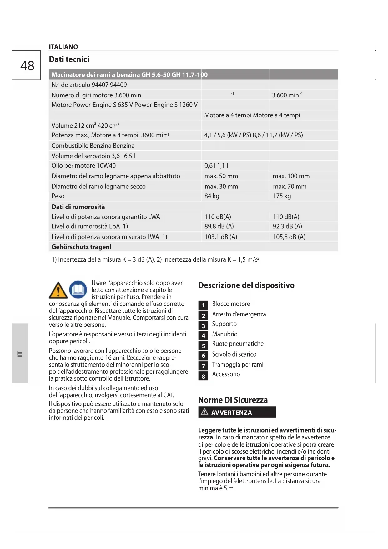 Usare l‘apparecchio solo dopo aver letto con attenzione e capito le istruzioni per l‘uso. Prendere in conoscenza gli elementi di comando e l’uso corretto dell’apparecchio. Rispettare tutte le istruzioni di sicurezza riportate nel Manuale. Comportarsi con cura verso le altre persone. L‘operatore è responsabile verso i terzi degli incidenti oppure pericoli. Possono lavorare con l‘apparecchiosolo le persone che hannoraggiunto 16 anni. L’eccezionerappre- senta lo sfruttamento deiminorenni per lo sco- podell’addestramento professionaleper raggiungere la pratica sottocontrollo dell‘istruttore. In caso dei dubbi sul collegamento ed uso dell‘apparecchio, rivolgersi cortesemente al CAT. Il dispositivo può essere utilizzato e mantenuto solo da persone che hanno familiarità con esso e sono stati informati dei pericoli. Descrizione del dispositivo