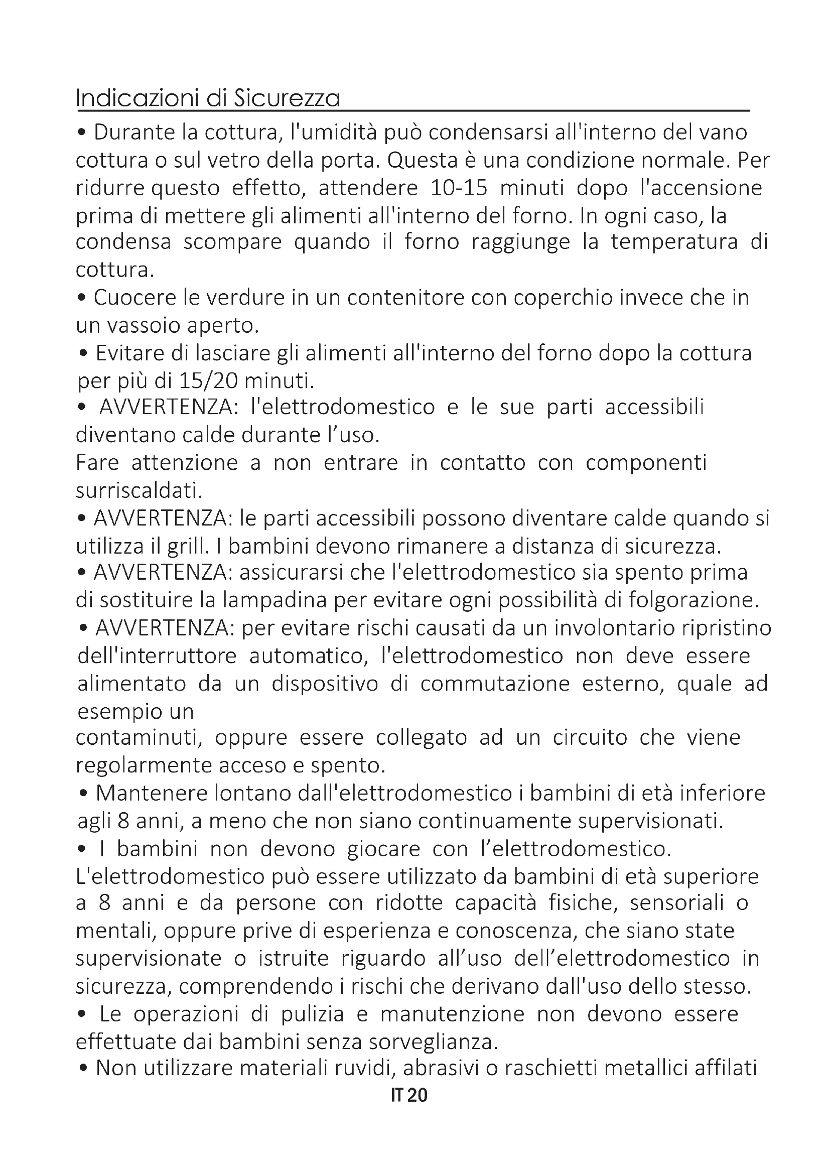 L’uso di un qualsiasi apparecchio elettrico comporta l’osservanza di alcune regole fondamentali: Utilizzare il forno solo per lo scopo per cui è stato progettato, ossia solo per la cottura di alimenti; qualsiasi altro utilizzo, ad esempio come fonte di riscaldamento, è considerato improprio e quindi pericoloso. Il costruttore non può essere considerato responsabile per eventuali danni derivanti da usi impropri, erronei ed irragionevoli. - in generale è sconsigliabile l’uso di adattatori, prese multiple e prolunghe; - in caso di guasto e/o cattivo funzionamento dell’apparecchio, spegnerlo e non manometterlo. - non tirare il cavo di alimentazione per scollegare il prodotto dalla fonte di alimentazione - non toccare l’apparecchio con mani o piedi bagnati o umidi;