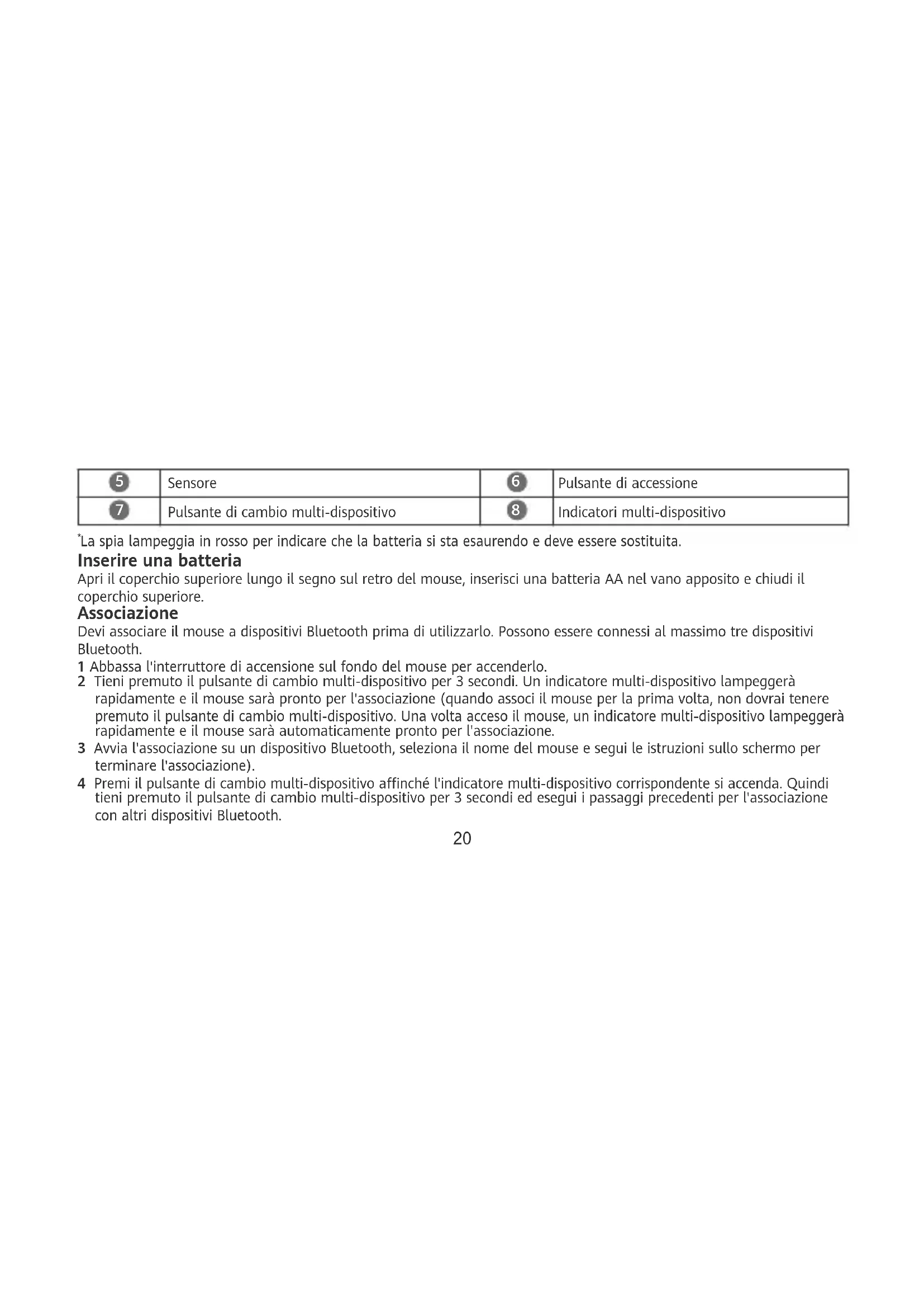 La spia lampeggia in rosso per indicare che la batteria si sta esaurendo e deve essere sostituita. Inserire una batteria Apri il coperchio superiore lungo il segno sul retro del mouse, inserisci una batteria AA nel vano apposito e chiudi il coperchio superiore. Associazione Devi associare il mouse a dispositivi Bluetooth prima di utilizzarlo. Possono essere connessi al massimo tre dispositivi Bluetooth. 1 Abbassa l'interruttore di accensione sul fondo del mouse per accenderlo. 2 Tieni premuto il pulsante di cambio multi-dispositivo per 3 secondi. Un indicatore multi-dispositivo lampeggerà rapidamente e il mouse sarà pronto per l'associazione (quando associ il mouse per la prima volta, non dovrai tenere premuto il pulsante di cambio multi-dispositivo. Una volta acceso il mouse, un indicatore multi-dispositivo lampeggerà rapidamente e il mouse sarà automaticamente pronto per l'associazione. 3 Avvia l'associazione su un dispositivo Bluetooth, seleziona il nome del mouse e segui le istruzioni sullo schermo per terminare l'associazione). 4 Premi il pulsante di cambio multi-dispositivo anché l'indicatore multi-dispositivo corrispondente si accenda. Quindi tieni premuto il pulsante di cambio multi-dispositivo per 3 secondi ed esegui i passaggi precedenti per l'associazione con altri dispositivi Bluetooth. 20Il mouse supporta solo dispositivi con Windows 10, Windows 8.1, macOS 10.10, iOS 13.1, HarmonyOS 2, Android 5.0 o versioni successive oppure Linux. Utilizzo Premi il pulsante di cambio multi-dispositivo per passare da un dispositivo Bluetooth all'altro. Informazioni sulla sicurezza