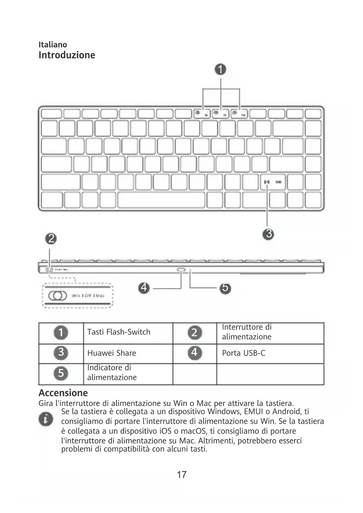 Indicatore di alimentazione Accensione Gira l'interruttore di alimentazione su Win o Mac per attivare la tastiera. Se la tastiera è collegata a un dispositivo Windows, EMUI o Android, ti consigliamo di portare l'interruttore di alimentazione su Win. Se la tastiera è collegata a un dispositivo iOS o macOS, ti consigliamo di portare l'interruttore di alimentazione su Mac. Altrimenti, potrebbero esserci problemi di compatibilità con alcuni tasti. 17Connessione 1 Posiziona la tastiera vicino a un dispositivo e tieni premuto qualsiasi tasto dell'interruttore ash per più di tre secondi per avviare l'associazione (una volta alimentata la tastiera per la prima volta, si avvierà automaticamente l'associazione senza la necessità di tenere premuto un tasto dell'interruttore ash). 2 Una richiesta sarà allora visualizzata sul dispositivo. Segui le istruzioni sullo schermo per completare l'associazione.