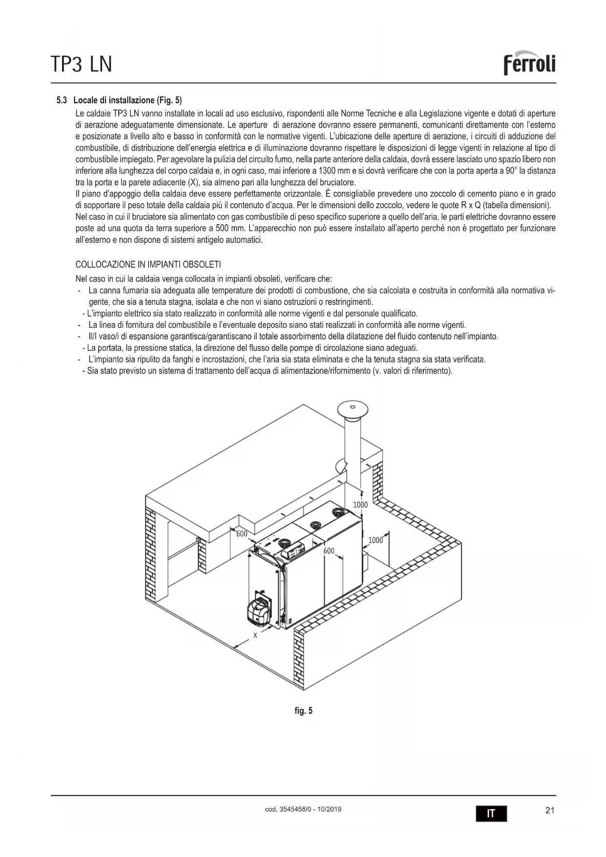 Le caldaie TP3 LN vanno installate in locali ad uso esclusivo, rispondenti alle Norme Tecniche e alla Legislazione vigente e dotati di aperture di aerazione adeguatamente dimensionate. Le aperture di aerazione dovranno essere permanenti, comunicanti direttamente con l’esterno e posizionate a livello alto e basso in conformità con le normative vigenti. L’ubicazione delle aperture di aerazione, i circuiti di adduzione del combustibile, di distribuzione dell’energia elettrica e di illuminazione dovranno rispettare le disposizioni di legge vigenti in relazione al tipo di combustibile impiegato. Per agevolare la pulizia del circuito fumo, nella parte anteriore della caldaia, dovrà essere lasciato uno spazio libero non inferiore alla lunghezza del corpo caldaia e, in ogni caso, mai inferiore a 1300 mm e si dovrà verificare che con la porta aperta a 90° la distanza tra la porta e la parete adiacente (X), sia almeno pari alla lunghezza del bruciatore. Il piano d’appoggio della caldaia deve essere perfettamente orizzontale. È consigliabile prevedere uno zoccolo di cemento piano e in grado di sopportare il peso totale della caldaia più il contenuto d’acqua. Per le dimensioni dello zoccolo, vedere le quote R x Q (tabella dimensioni). Nel caso in cui il bruciatore sia alimentato con gas combustibile di peso specifico superiore a quello dell’aria, le parti elettriche dovranno essere poste ad una quota da terra superiore a 500 mm. L’apparecchio non può essere installato all’aperto perché non è progettato per funzionare all’esterno e non dispone di sistemi antigelo automatici.