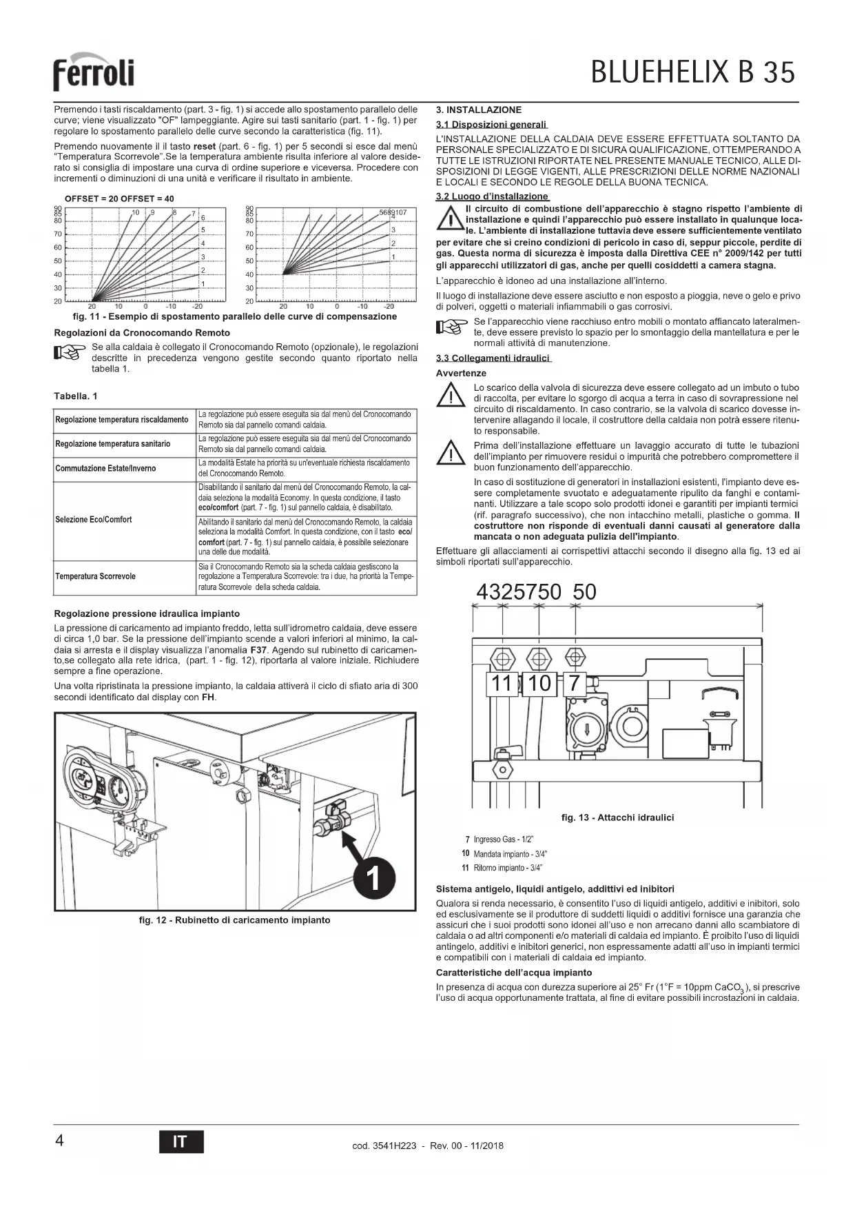cod. 3541H223 - Rev. 00 - 11/2018Premendo i tasti riscaldamento (part. 3 - fig. 1) si accede allo spostamento parallelo delle curve; viene visualizzato "OF" lampeggiante. Agire sui tasti sanitario (part. 1 - fig. 1) per regolare lo spostamento parallelo delle curve secondo la caratteristica (fig. 11). Premendo nuovamente il il tasto reset (part. 6 - fig. 1) per 5 secondi si esce dal menù “Temperatura Scorrevole”.Se la temperatura ambiente risulta inferiore al valore deside-rato si consiglia di impostare una curva di ordine superiore e viceversa. Procedere conincrementi o diminuzioni di una unità e verificare il risultato in ambiente.fig. 11 - Esempio di spostamento parallelo delle curve di compensazioneRegolazioni da Cronocomando Remoto Se alla caldaia è collegato il Cronocomando Remoto (opzionale), le regolazionidescritte in precedenza vengono gestite secondo quanto riportato nellatabella 1.Tabella. 1Regolazione pressione idraulica impiantoLa pressione di caricamento ad impianto freddo, letta sull’idrometro caldaia, deve esseredi circa 1,0 bar. Se la pressione dell’impianto scende a valori inferiori al minimo, la cal- daia si arresta e il display visualizza l’anomalia F37. Agendo sul rubinetto di caricamen- to,se collegato alla rete idrica, (part. 1 - fig. 12), riportarla al valore iniziale. Richiuderesempre a fine operazione.Una volta ripristinata la pressione impianto, la caldaia attiverà il ciclo di sfiato aria di 300secondi identificato dal display con FH.fig. 12 - Rubinetto di caricamento impianto3. INSTALLAZIONE3.1 Disposizioni generaliL'INSTALLAZIONE DELLA CALDAIA DEVE ESSERE EFFETTUATA SOLTANTO DAPERSONALE SPECIALIZZATO E DI SICURA QUALIFICAZIONE, OTTEMPERANDO ATUTTE LE ISTRUZIONI RIPORTATE NEL PRESENTE MANUALE TECNICO, ALLE DI-SPOSIZIONI DI LEGGE VIGENTI, ALLE PRESCRIZIONI DELLE NORME NAZIONALIE LOCALI E SECONDO LE REGOLE DELLA BUONA TECNICA.L’apparecchio è idoneo ad una installazione all’interno.Il luogo di installazione deve essere asciutto e non esposto a pioggia, neve o gelo e privodi polveri, oggetti o materiali infiammabili o gas corrosivi. Se l’apparecchio viene racchiuso entro mobili o montato affiancato lateralmen-te, deve essere previsto lo spazio per lo smontaggio della mantellatura e per lenormali attività di manutenzione.3.3 Collegamenti idrauliciAvvertenze Lo scarico della valvola di sicurezza deve essere collegato ad un imbuto o tubodi raccolta, per evitare lo sgorgo di acqua a terra in caso di sovrapressione nelcircuito di riscaldamento. In caso contrario, se la valvola di scarico dovesse in-tervenire allagando il locale, il costruttore della caldaia non potrà essere ritenu-to responsabile. Prima dell’installazione effettuare un lavaggio accurato di tutte le tubazionidell’impianto per rimuovere residui o impurità che potrebbero compromettere ilbuon funzionamento dell’apparecchio.In caso di sostituzione di generatori in installazioni esistenti, l'impianto deve es-sere completamente svuotato e adeguatamente ripulito da fanghi e contami-nanti. Utilizzare a tale scopo solo prodotti idonei e garantiti per impianti termici(rif. paragrafo successivo), che non intacchino metalli, plastiche o gomma. Ilcostruttore non risponde di eventuali danni causati al generatore dallamancata o non adeguata pulizia dell'impianto.Effettuare gli allacciamenti ai corrispettivi attacchi secondo il disegno alla fig. 13 ed aisimboli riportati sull’apparecchio.fig. 13 - Attacchi idrauliciSistema antigelo, liquidi antigelo, addittivi ed inibitoriQualora si renda necessario, è consentito l’uso di liquidi antigelo, additivi e inibitori, soloed esclusivamente se il produttore di suddetti liquidi o additivi fornisce una garanzia cheassicuri che i suoi prodotti sono idonei all’uso e non arrecano danni allo scambiatore dicaldaia o ad altri componenti e/o materiali di caldaia ed impianto. È proibito l’uso di liquidiantingelo, additivi e inibitori generici, non espressamente adatti all’uso in impianti termicie compatibili con i materiali di caldaia ed impianto.Caratteristiche dell’acqua impiantoIn presenza di acqua con durezza superiore ai 25° Fr (1°F = 10ppm CaCO ), si prescrivel’uso di acqua opportunamente trattata, al fine di evitare possibili incrostazioni in caldaia.Regolazione temperatura riscaldamentoLa regolazione può essere eseguita sia dal menù del Cronocomando Remoto sia dal pannello comandi caldaia.Regolazione temperatura sanitarioLa regolazione può essere eseguita sia dal menù del Cronocomando Remoto sia dal pannello comandi caldaia.Commutazione Estate/InvernoLa modalità Estate ha priorità su un'eventuale richiesta riscaldamento del Cronocomando Remoto.Selezione Eco/ComfortDisabilitando il sanitario dal menù del Cronocomando Remoto, la cal-daia seleziona la modalità Economy. In questa condizione, il tasto eco/comfort (part. 7 - fig. 1) sul pannello caldaia, è disabilitato.Abilitando il sanitario dal menù del Cronocomando Remoto, la caldaia seleziona la modalità Comfort. In questa condizione, con il tasto eco/ comfort (part. 7 - fig. 1) sul pannello caldaia, è possibile selezionare una delle due modalità.Temperatura ScorrevoleSia il Cronocomando Remoto sia la scheda caldaia gestiscono la regolazione a Temperatura Scorrevole: tra i due, ha priorità la Tempe-ratura Scorrevole della scheda caldaia.