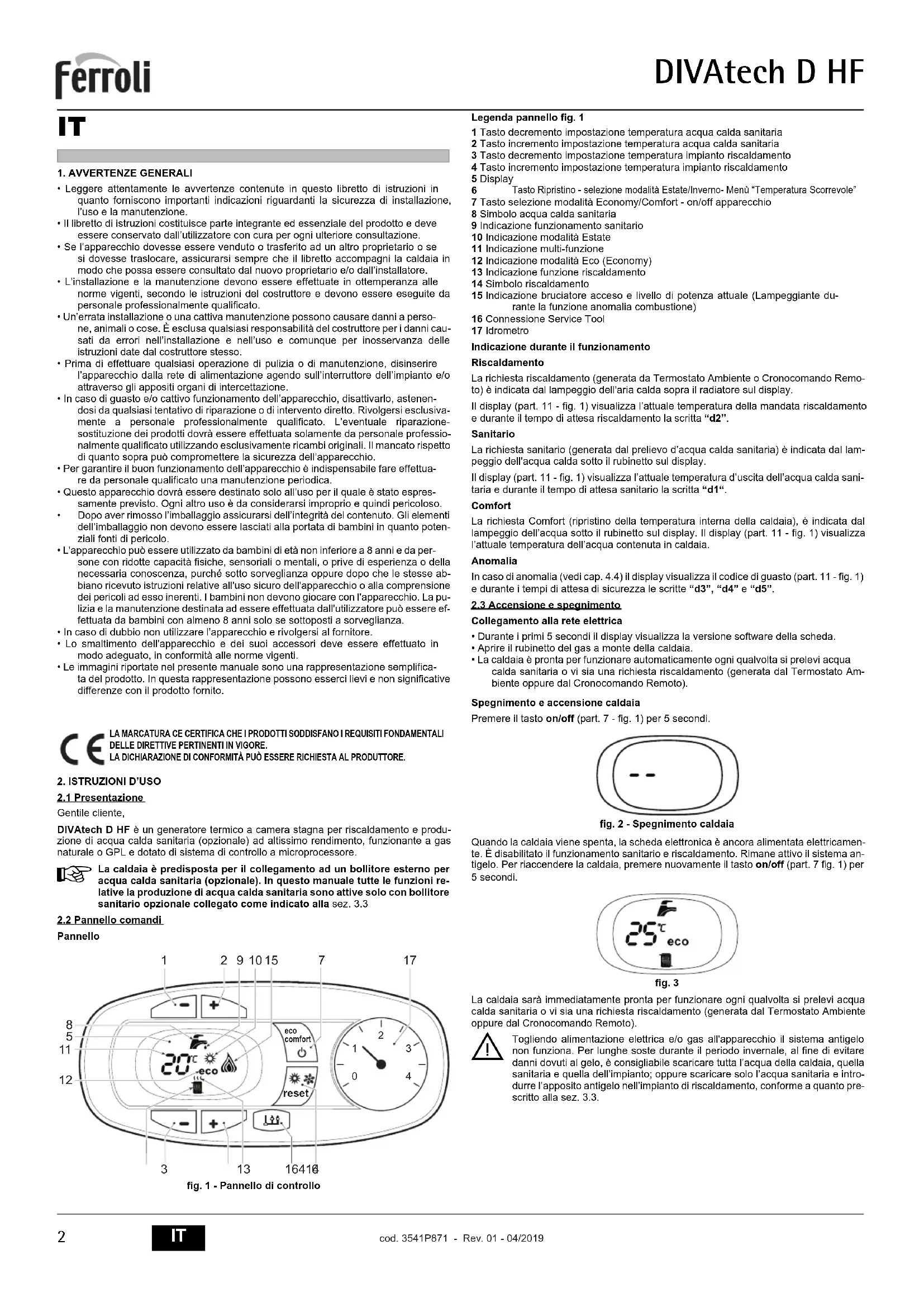 - Dopo aver rimosso l’imballaggio assicurarsi dell’integrità del contenuto. Gli elementi dell’imballaggio non devono essere lasciati alla portata di bambini in quanto poten-ziali fonti di pericolo.• L'apparecchio può essere utilizzato da bambini di età non inferiore a 8 anni e da per-sone con ridotte capacità fisiche, sensoriali o mentali, o prive di esperienza o dellanecessaria conoscenza, purché sotto sorveglianza oppure dopo che le stesse ab-biano ricevuto istruzioni relative all'uso sicuro dell'apparecchio o alla comprensionedei pericoli ad esso inerenti. I bambini non devono giocare con l'apparecchio. La pu-lizia e la manutenzione destinata ad essere effettuata dall'utilizzatore può essere ef-fettuata da bambini con almeno 8 anni solo se sottoposti a sorveglianza.• In caso di dubbio non utilizzare l’apparecchio e rivolgersi al fornitore.• Lo smaltimento dell'apparecchio e dei suoi accessori deve essere effettuato inmodo adeguato, in conformità alle norme vigenti.• Le immagini riportate nel presente manuale sono una rappresentazione semplifica-ta del prodotto. In questa rappresentazione possono esserci lievi e non significativedifferenze con il prodotto fornito.2. ISTRUZIONI D’USO2.1 PresentazioneGentile cliente,DIVAtech D HF è un generatore termico a camera stagna per riscaldamento e produ-zione di acqua calda sanitaria (opzionale) ad altissimo rendimento, funzionante a gasnaturale o GPL e dotato di sistema di controllo a microprocessore. La caldaia è predisposta per il collegamento ad un bollitore esterno peracqua calda sanitaria (opzionale). In questo manuale tutte le funzioni re-lative la produzione di acqua calda sanitaria sono attive solo con bollitoresanitario opzionale collegato come indicato alla sez. 3.32.2 Pannello comandiPannellofig. 1 - Pannello di controlloLegenda pannello fig. 11 Tasto decremento impostazione temperatura acqua calda sanitaria2 Tasto incremento impostazione temperatura acqua calda sanitaria3 Tasto decremento impostazione temperatura impianto riscaldamento4 Tasto incremento impostazione temperatura impianto riscaldamento5 Display Tasto Ripristino - selezione modalità Estate/Inverno- Menù “Temperatura Scorrevole”7 Tasto selezione modalità Economy/Comfort - on/off apparecchio8 Simbolo acqua calda sanitaria9 Indicazione funzionamento sanitario10 Indicazione modalità Estate11 Indicazione multi-funzione12 Indicazione modalità Eco (Economy)13 Indicazione funzione riscaldamento14 Simbolo riscaldamento15 Indicazione bruciatore acceso e livello di potenza attuale (Lampeggiante du-rante la funzione anomalia combustione)16 Connessione Service Tool17 IdrometroIndicazione durante il funzionamentoRiscaldamentoLa richiesta riscaldamento (generata da Termostato Ambiente o Cronocomando Remo-to) è indicata dal lampeggio dell'aria calda sopra il radiatore sul display.Il display (part. 11 - fig. 1) visualizza l’attuale temperatura della mandata riscaldamento e durante il tempo di attesa riscaldamento la scritta “d2”. SanitarioLa richiesta sanitario (generata dal prelievo d’acqua calda sanitaria) è indicata dal lam-peggio dell'acqua calda sotto il rubinetto sul display.Il display (part. 11 - fig. 1) visualizza l’attuale temperatura d’uscita dell’acqua calda sani- taria e durante il tempo di attesa sanitario la scritta “d1“. ComfortLa richiesta Comfort (ripristino della temperatura interna della caldaia), è indicata dallampeggio dell’acqua sotto il rubinetto sul display. Il display (part. 11 - fig. 1) visualizzal’attuale temperatura dell’acqua contenuta in caldaia.AnomaliaIn caso di anomalia (vedi cap. 4.4) il display visualizza il codice di guasto (part. 11 - fig. 1) e durante i tempi di attesa di sicurezza le scritte “d3”, “d4” e “d5”. 2.3 Accensione e spegnimentoCollegamento alla rete elettrica• Durante i primi 5 secondi il display visualizza la versione software della scheda.• Aprire il rubinetto del gas a monte della caldaia.• La caldaia è pronta per funzionare automaticamente ogni qualvolta si prelevi acquacalda sanitaria o vi sia una richiesta riscaldamento (generata dal Termostato Am-biente oppure dal Cronocomando Remoto).Spegnimento e accensione caldaia Premere il tasto on/off (part. 7 - fig. 1) per 5 secondi. fig. 2 - Spegnimento caldaiaQuando la caldaia viene spenta, la scheda elettronica è ancora alimentata elettricamen-te. È disabilitato il funzionamento sanitario e riscaldamento. Rimane attivo il sistema an- tigelo. Per riaccendere la caldaia, premere nuovamente il tasto on/off (part. 7 fig. 1) per 5 secondi.fig. 3La caldaia sarà immediatamente pronta per funzionare ogni qualvolta si prelevi acquacalda sanitaria o vi sia una richiesta riscaldamento (generata dal Termostato Ambienteoppure dal Cronocomando Remoto). Togliendo alimentazione elettrica e/o gas all'apparecchio il sistema antigelonon funziona. Per lunghe soste durante il periodo invernale, al fine di evitaredanni dovuti al gelo, è consigliabile scaricare tutta l’acqua della caldaia, quellasanitaria e quella dell’impianto; oppure scaricare solo l’acqua sanitaria e intro-durre l’apposito antigelo nell’impianto di riscaldamento, conforme a quanto pre-scritto alla sez. 3.3.LA MARCATURA CE CERTIFICA CHE I PRODOTTI SODDISFANO I REQUISITI FONDAMENTALI DELLE DIRETTIVE PERTINENTI IN VIGORE.LA DICHIARAZIONE DI CONFORMITÀ PUÒ ESSERE RICHIESTA AL PRODUTTORE.