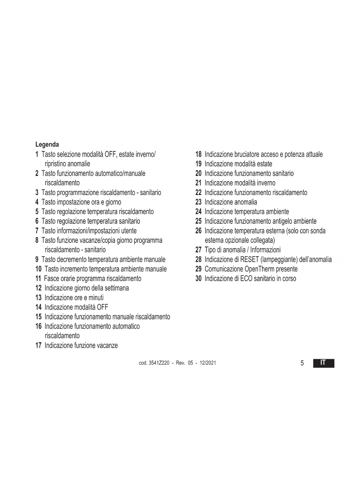 4Legenda 1 Tasto selezione modalità OFF, estate inverno/ ripristino anomalie 2 Tasto funzionamento automatico/manuale riscaldamento 3 Tasto programmazione riscaldamento - sanitario 4 Tasto impostazione ora e giorno 5 Tasto regolazione temperatura riscaldamento 6 Tasto regolazione temperatura sanitario 7 Tasto informazioni/impostazioni utente 8 Tasto funzione vacanze/copia giorno programma riscaldamento - sanitario 9 Tasto decremento temperatura ambiente manuale 10 Tasto incremento temperatura ambiente manuale 11 Fasce orarie programma riscaldamento 12 Indicazione giorno della settimana 13 Indicazione ore e minuti 14 Indicazione modalità OFF 15 Indicazione funzionamento manuale riscaldamento 16 Indicazione funzionamento automatico riscaldamento 17 Indicazione funzione vacanze 18 Indicazione bruciatore acceso e potenza attuale 19 Indicazione modalità estate 20 Indicazione funzionamento sanitario 21 Indicazione modalità inverno 22 Indicazione funzionamento riscaldamento 23 Indicazione anomalia 24 Indicazione temperatura ambiente 25 Indicazione funzionamento antigelo ambiente 26 Indicazione temperatura esterna (solo con sonda esterna opzionale collegata) 27 Tipo di anomalia / Informazioni 28 Indicazione di RESET (lampeggiante) dell’anomalia 29 Comunicazione OpenTherm presente 30 Indicazione di ECO sanitario in corso cod. 3541Z220 - Rev. 05 - 12/2021