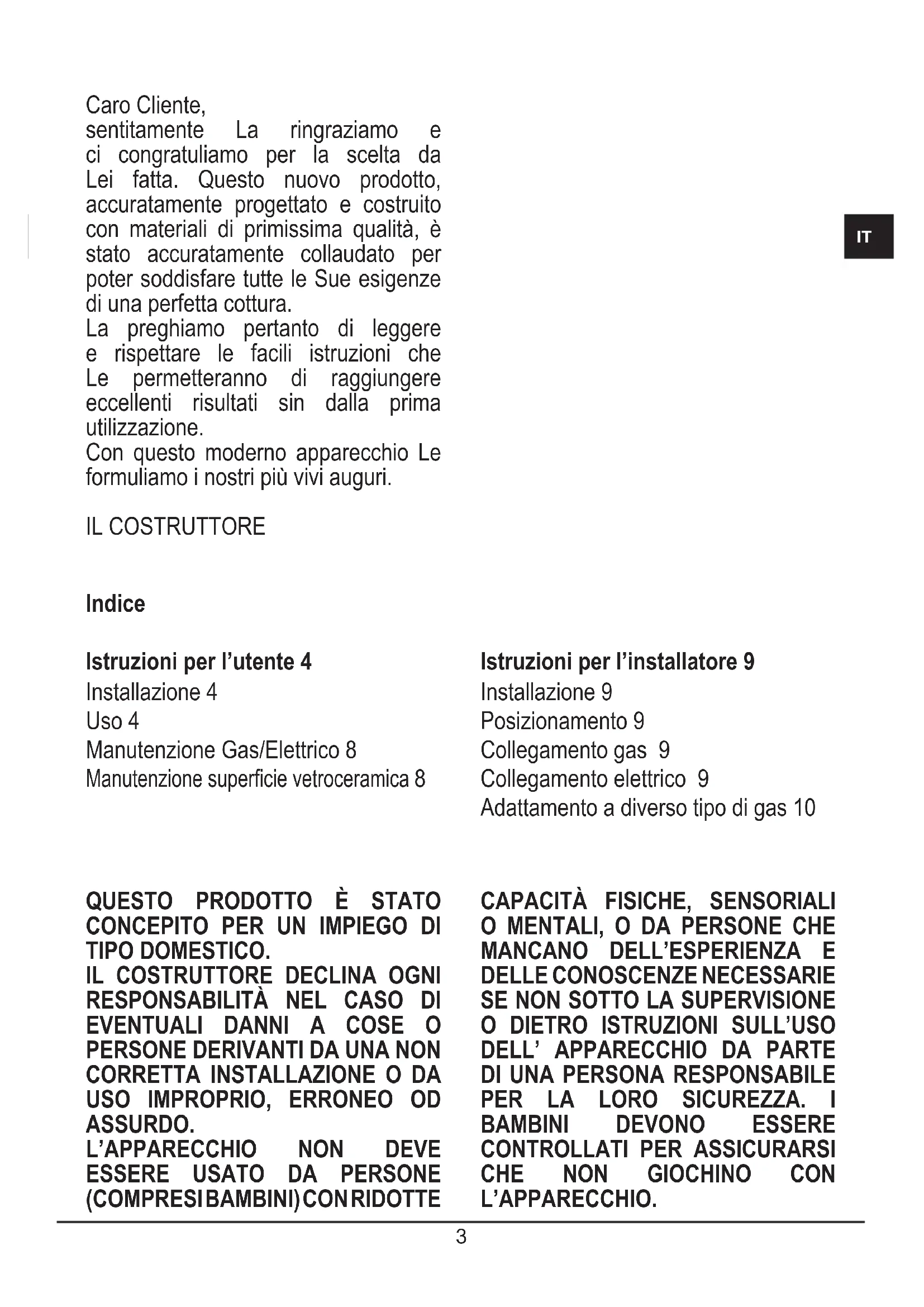 Caro Cliente, sentitamente La ringraziamo e ci congratuliamo per la scelta da Lei fatta. Questo nuovo prodotto, accuratamente progettato e costruito con materiali di primissima qualità, è stato accuratamente collaudato per poter soddisfare tutte le Sue esigenze di una perfetta cottura. La preghiamo pertanto di leggere e rispettare le facili istruzioni che Le permetteranno di raggiungere eccellenti risultati sin dalla prima utilizzazione. Con questo moderno apparecchio Le formuliamo i nostri più vivi auguri. IL COSTRUTTORE Indice Istruzioni per l’utente 4 Installazione 4 Uso 4 Manutenzione Gas/Elettrico 8 Manutenzione supercie vetroceramica
