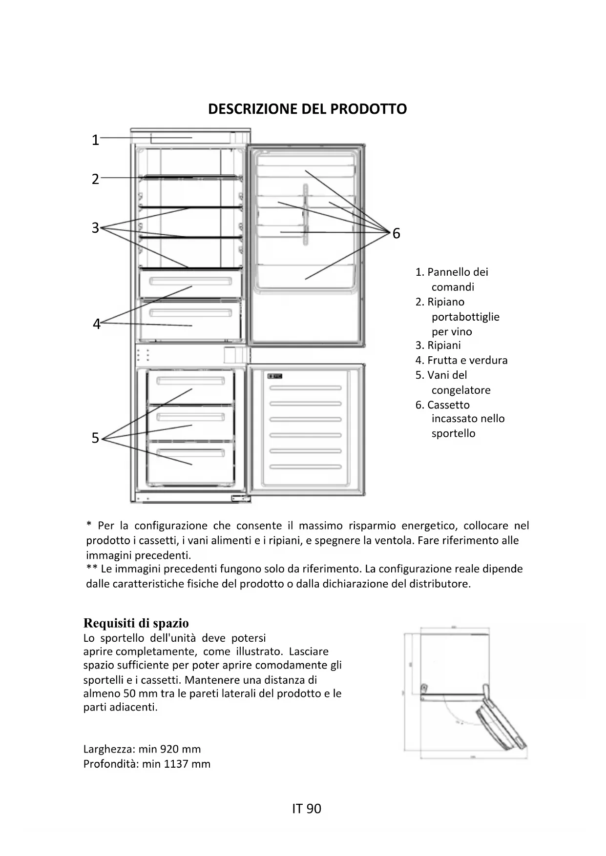 - Per la configurazione che consente il massimo risparmio energetico, collocare nel prodotto i cassetti, i vani alimenti e i ripiani, e spegnere la ventola. Fare riferimento alleimmagini precedenti.** Le immagini precedenti fungono solo da riferimento. La configurazione reale dipendedalle caratteristiche fisiche del prodotto o dalla dichiarazione del distributore.Requisiti di spazio Lo sportello dell'unità deve potersi aprire completamente, come illustrato. Lasciare spazio sufficiente per poter aprire comodamente gli sportelli e i cassetti. Mantenere una distanza di almeno 50 mm tra le pareti laterali del prodotto e le parti adiacenti.Larghezza: min 920 mmProfondità: min 1137 mm1. Pannello deicomandi2. Ripianoportabottiglieper vino3. Ripiani4. Frutta e verdura5. Vani delcongelatore6. Cassettoincassato nellosportello