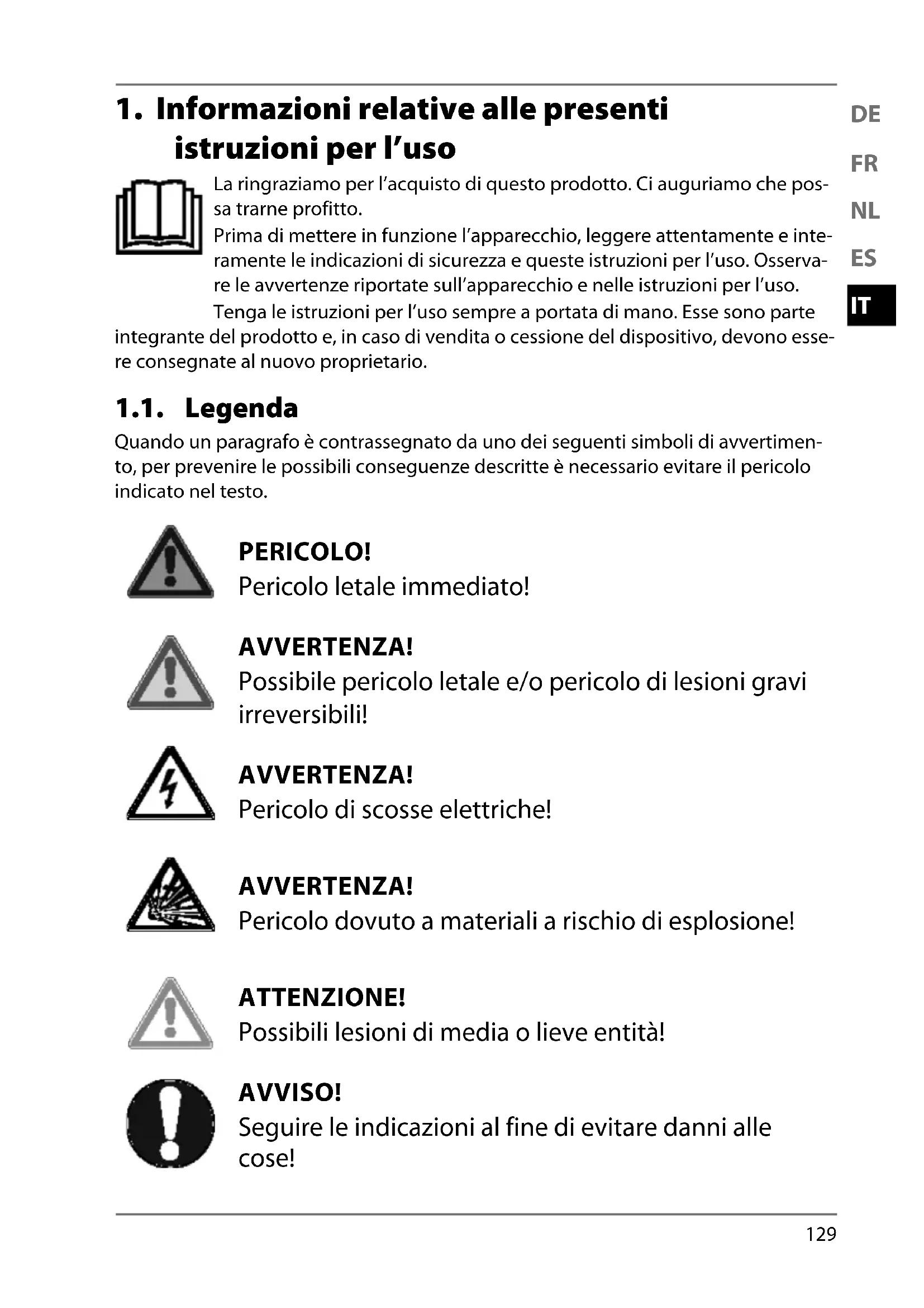 1. Informazioni relative alle presenti istruzioni per l’uso ........................ 129