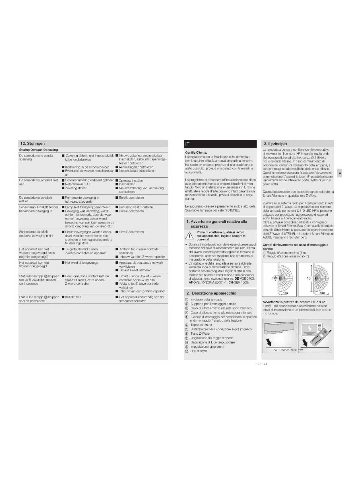 Gentile Cliente, La ringraziamo per la fiducia che ci ha dimostrato con l'acquisto della Sua nuova lampada a sensore. Ha scelto un prodotto pregiato di alta qualità che è stato costruito, provato e imballato con la massima scrupolosità. La preghiamo di procedere all'installazione solo dopo aver letto attentamente le presenti istruzioni di mon- taggio. Solo un'installazione e una messa in funzione eettuate a regola d'arte possono infatti garantire un funzionamento adabile, privo di disturbi e di lunga durata. Le auguriamo di essere pienamente soddisfatto della Sua nuova lampada per esterni STEINEL.