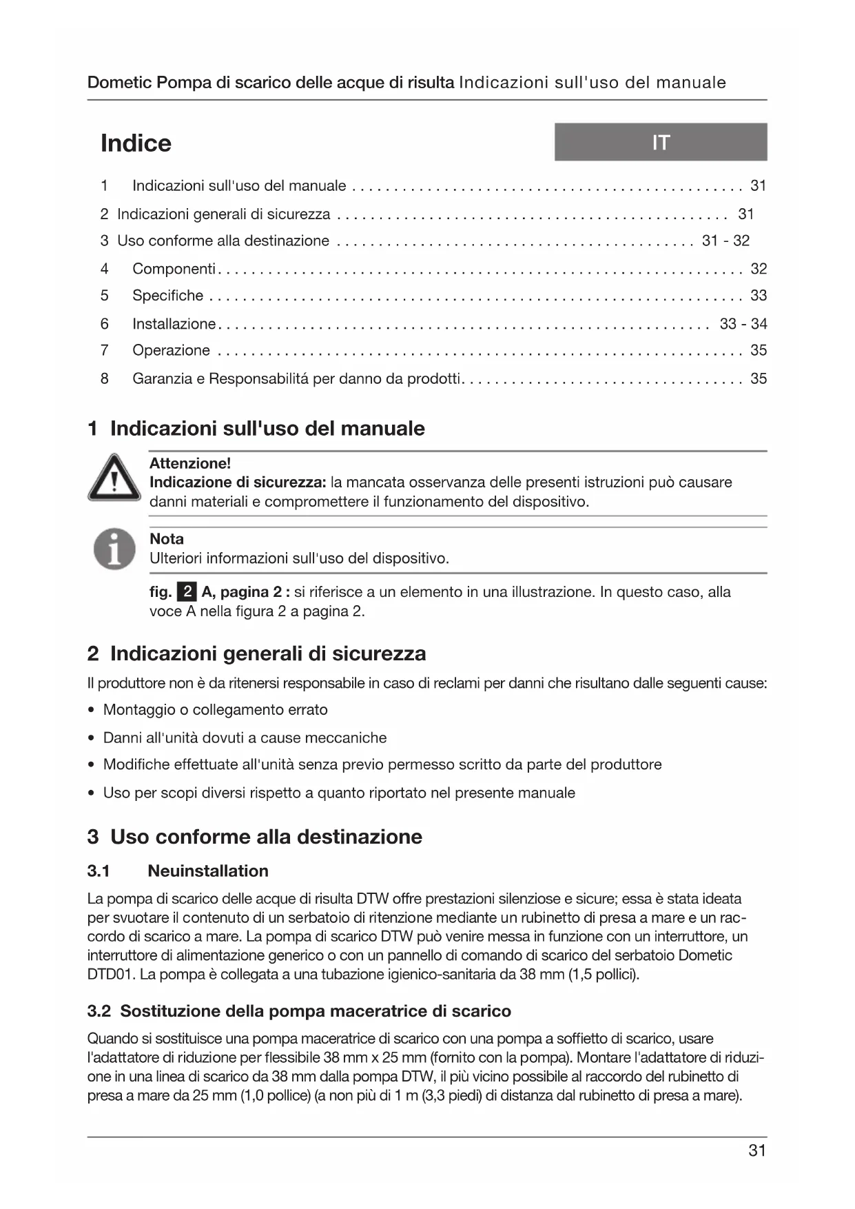 - Rif. Descrizione E rosso F interruttore di alimentazione (accesa / spenta) Notas: 1. Usare un cavo in rame avvolto a treccia da 14 gauge o più grande.2. Valore massimo interruttore di circuito o fusibile della pompa di scarico: 20 amp35 Dometic Pompa di scarico delle acque di risulta Operazione 7 Operazione Se si è in acque nelle quali è consentito lo scarico a mare del serbatoio di ritenzione, aprire il rubinetto di presa a mare (se possibile) e collegare l'alimentazione elettrica della pompa di scarico. Una volta completata l'operazione di scarico, spegnere l'alimentazione della pompa di scarico. Attenzione! APRIRE IL RUBINETTO DI PRESA A MARE PRIMA DI ATTIVARE LA POMPA DI SCARICO. Se la pompa viene messa in funzione con il rubinetto di presa a mare chiuso, le valvole a becco d'anatra della pompa si danneggiano e dovranno essere sostituite. Attenzione! Assicurarsi che la pompa di scarico non funzioni per un periodo di tempo prolungato quando non viene scaricato dal serbatoio di ritenzione. Potrebbero vericarsi danni alla pompa. Attenzione! L'operatore deve essere a conoscenza delle normative locali relative allo scarico di un serbatoio di ritenzione. Attenzione! La pompa di scarico potrebbe avviarsi automaticamente. Spegnere l'alimentazione elettrica prima di effettuare operazioni di manutenzione. Europa: Garanzia e Servizio clienti Le disposizioni di garanzia sono conformi alla direttiva CE 44/1999/CE e alle condizioni generali in vigore nel Paese in questione. In caso di informazioni relative alla garanzia o ad altri servizi, contattare il Servizio clienti Dometic/Waeco al recapito riportato in unaltra sezione del presente manuale. Qualsiasi tipo di danno causato da un uso improprio non è coperto da garanzia. La garanzia non comprende qualsiasi tipo di modica apportata al prodotto o luso di parti non originali Dometic; inoltre, la garanzia non è valida, e ci non si assume pertanto nessun tipo di responsabilità, nel caso in cui non siano state osservate le istruzioni di installazione e uso. Responsabilità per danno da prodotti La responsabilità per danno da prodotti del gruppo Dometic e delle sue liali non include i danni causati da: cattivo uso; modiche o interventi impropri allapparecchiatura; effetti ambientali avversi che possono dan- neggiare lapparecchiatura stessa o la diretta vicinanza dellapparecchiatura o di persone in questa area. Per usufruire del servizio di garanzia, contattare per prima cosa il proprio rappresentante locale presso il quale è stato acquistato il prodotto o visitare la pagina Web: http://www.dometic.com per trovare il rappresentante più vicino. 8 Garanzia e Responsabilità per danno da prodotti ® registrato; ™ marchio registrato di Dometic Corporation36 1 Käsikirjan käyttöä koskevia huomautuksia p. 36