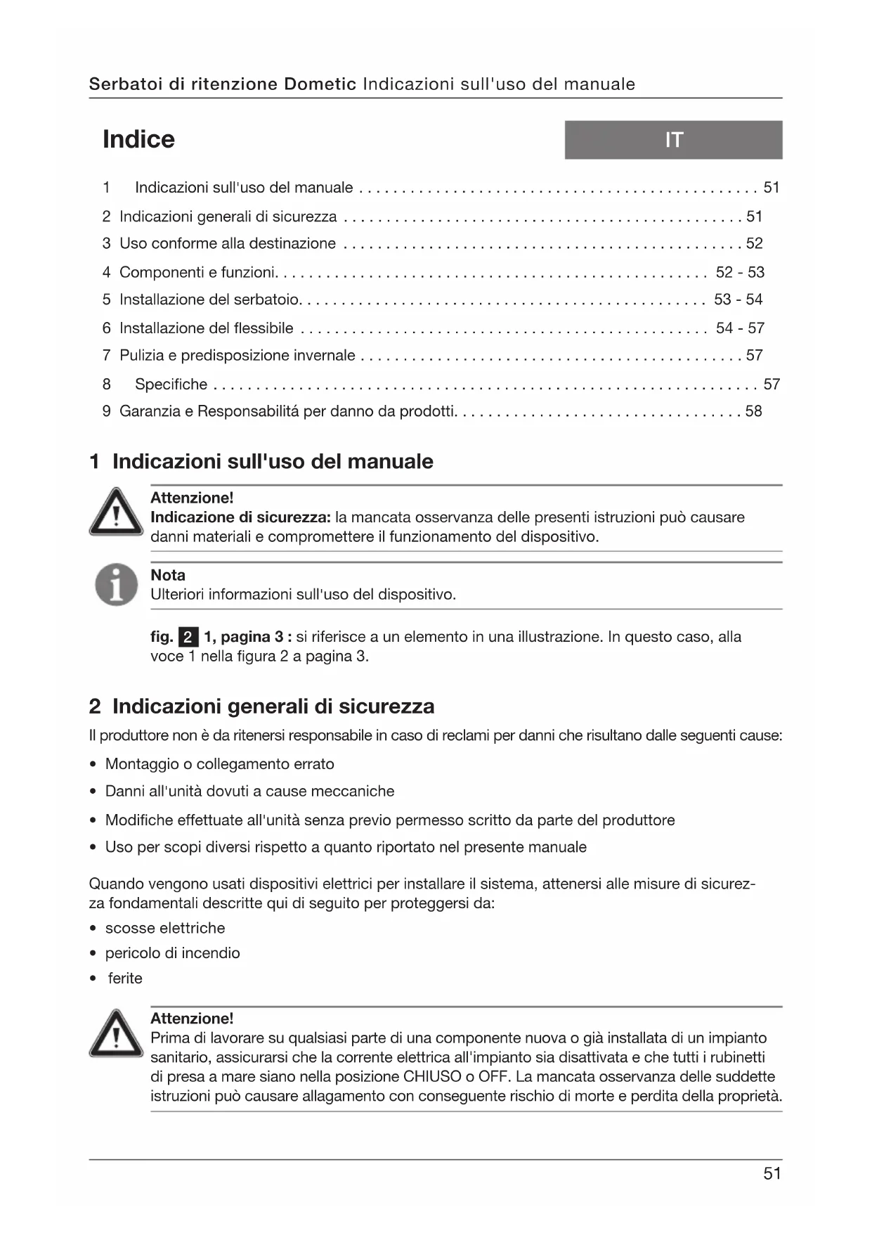 - ferite52 Serbatoi di ritenzione DometicUso conforme alla destinazione Nota Ciascun dispositivo per lo scarico di acque grigie in un serbatoio di ritenzione deve essere dotato di un livello di sicurezza dell'acqua per impedire che i cattivi odori penetrino nello spazio abitabile. Attenzione! L'operatore dell'imbarcazione deve conoscere le norme locali relative allo scarico di acque nere. 3 Uso conforme alla destinazione I sistemi di ritenzione Dometic dispongono di un'apparecchiatura di alta qualità e di lunga vita utile per conservare acque di scarico provenienti WC a bordo di un'imbarcazione; scaricare in modo efciente le acque di scarico presso impianti di smaltimento approvati o in acque non protette; impedire che le acque nere deteriorino acque sensibili, ad esempio nelle marine, vicino a spiagge balneabili o in un parco molluschi. È possibile utilizzare i serbatoi di ritenzione per la raccolta di acque grigie (scarichi di docce, lavandini, lavatrici, ecc.), solo se essi vengono utilizzati per lo stoccaggio di sole acque grigie. 4 Componenti e funzioni Voci la fig. , pagina 3 Descrizione 1 Collegamenti dei essibili di uscita da 38 mm (1,5 in.) al raccordo in coperta o al rubinetto di presa a mare 2 Collegamenti dei essibili di uscita da 38 mm (1,5 in.) al raccordo in coperta o al rubinetto di presa a mare