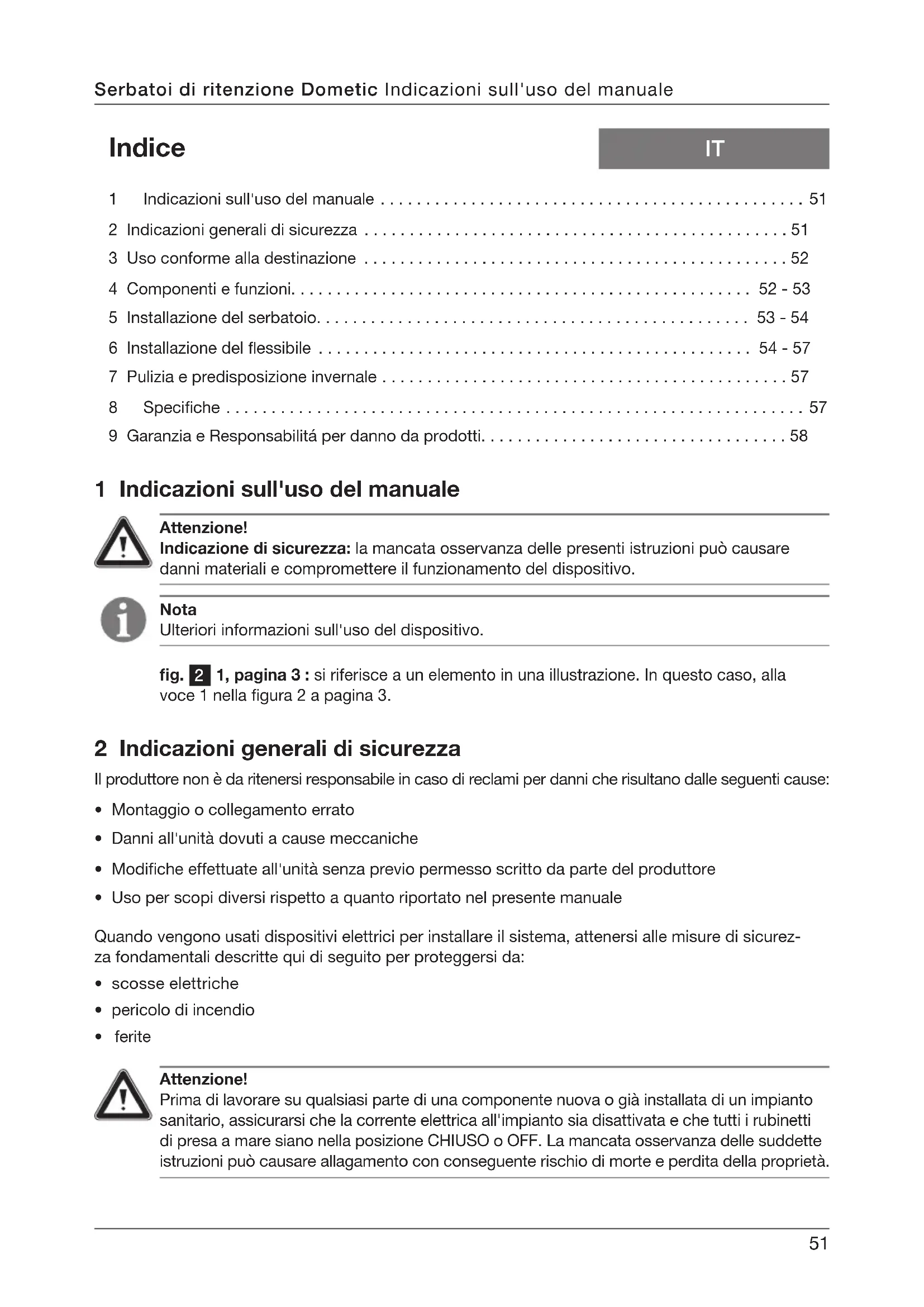 - ferite52 Serbatoi di ritenzione DometicUso conforme alla destinazione Nota Ciascun dispositivo per lo scarico di acque grigie in un serbatoio di ritenzione deve essere dotato di un livello di sicurezza dell'acqua per impedire che i cattivi odori penetrino nello spazio abitabile. Attenzione! L'operatore dell'imbarcazione deve conoscere le norme locali relative allo scarico di acque nere. 3 Uso conforme alla destinazione I sistemi di ritenzione Dometic dispongono di un'apparecchiatura di alta qualità e di lunga vita utile per conservare acque di scarico provenienti WC a bordo di un'imbarcazione; scaricare in modo efciente le acque di scarico presso impianti di smaltimento approvati o in acque non protette; impedire che le acque nere deteriorino acque sensibili, ad esempio nelle marine, vicino a spiagge balneabili o in un parco molluschi. È possibile utilizzare i serbatoi di ritenzione per la raccolta di acque grigie (scarichi di docce, lavandini, lavatrici, ecc.), solo se essi vengono utilizzati per lo stoccaggio di sole acque grigie. 4 Componenti e funzioni Voci la fig. , pagina 3 Descrizione 1 Collegamenti dei essibili di uscita da 38 mm (1,5 in.) al raccordo in coperta o al rubinetto di presa a mare 2 Collegamenti dei essibili di uscita da 38 mm (1,5 in.) al raccordo in coperta o al rubinetto di presa a mare