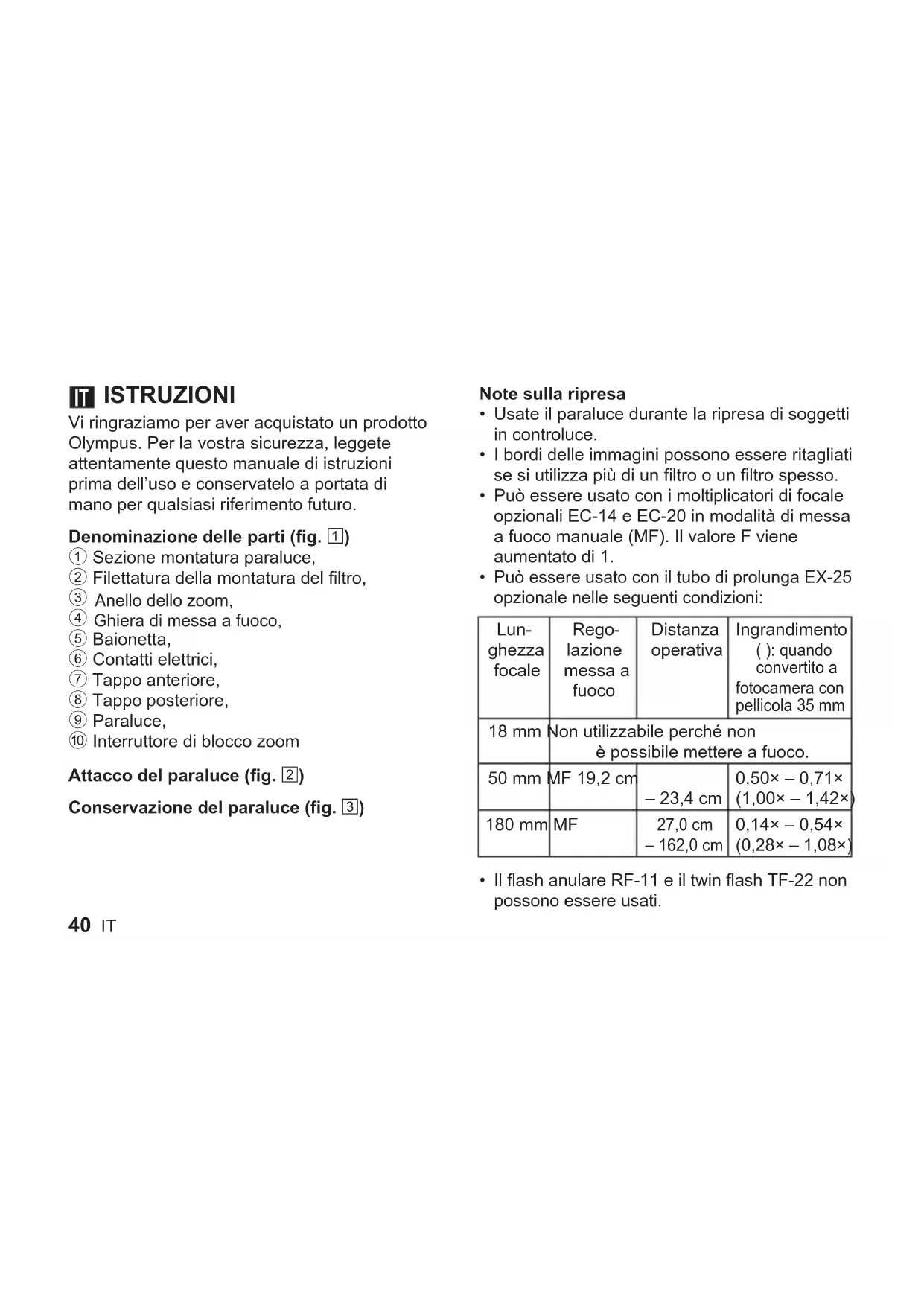 L1002_hu_cs2e.indd 39L1002_hu_cs2e.indd 39 8/28/2008 4:21:53 PM8/28/2008 4:21:53 PM40 IT ISTRUZIONI Vi ringraziamo per aver acquistato un prodotto Olympus. Per la vostra sicurezza, leggete attentamente questo manuale di istruzioni prima dell’uso e conservatelo a portata di mano per qualsiasi riferimento futuro. Denominazione delle parti (fig. 1) 1 Sezione montatura paraluce, 2 Filettatura della montatura del filtro,