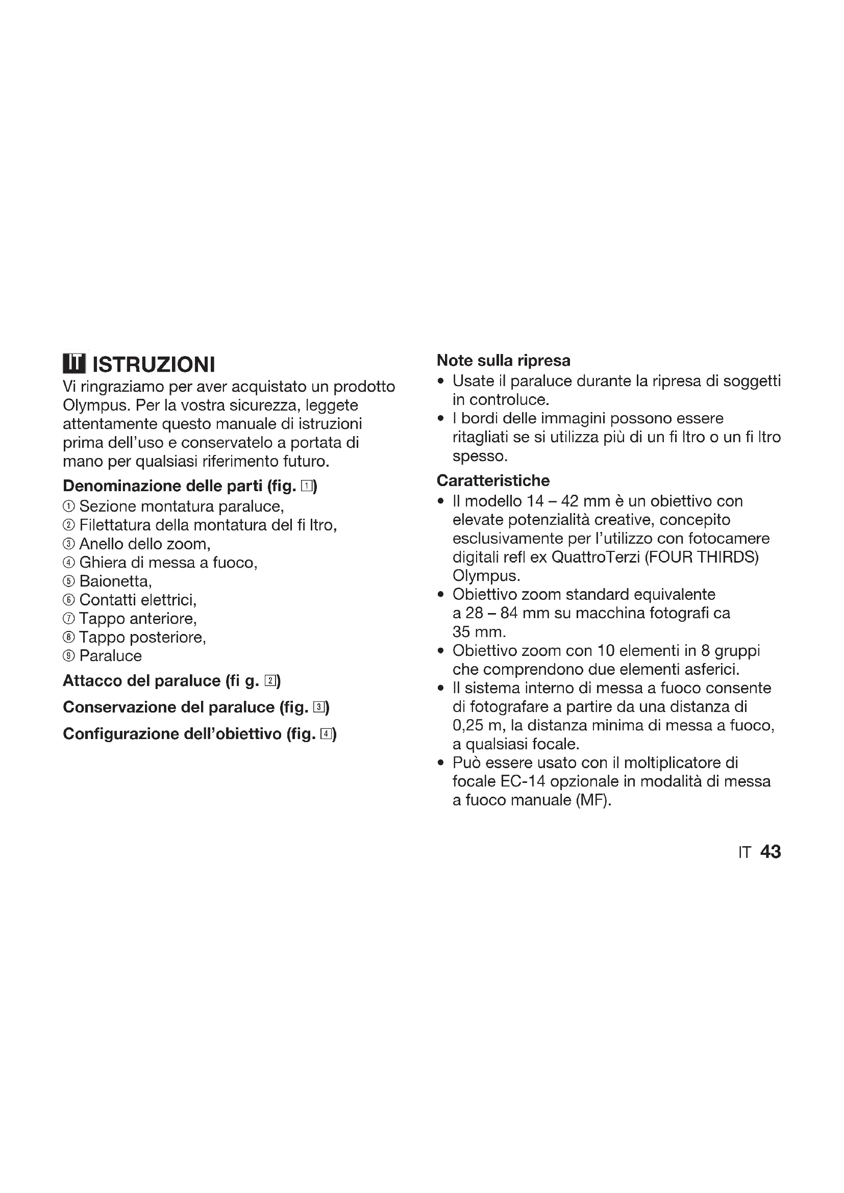 42IT 43 ISTRUZIONI Vi ringraziamo per aver acquistato un prodotto Olympus. Per la vostra sicurezza, leggete attentamente questo manuale di istruzioni prima dell’uso e conservatelo a portata di mano per qualsiasi riferimento futuro. Denominazione delle parti (fi g. 1) 1 Sezione montatura paraluce, 2 Filettatura della montatura del fi ltro, 3 Anello dello zoom, 4 Ghiera di messa a fuoco, 5 Baionetta, 6 Contatti elettrici, 7 Tappo anteriore, 8 Tappo posteriore, 9 Paraluce Attacco del paraluce (fi g. 2) Conservazione del paraluce (fi g. 3) Confi gurazione dell’obiettivo (fi g. 4) Note sulla ripresa Usate il paraluce durante la ripresa di soggetti in controluce. I bordi delle immagini possono essere ritagliati se si utilizza più di un fi ltro o un fi ltro spesso. Caratteristiche Il modello 14 – 42 mm è un obiettivo con elevate potenzialità creative, concepito esclusivamente per l’utilizzo con fotocamere digitali refl ex QuattroTerzi (FOUR THIRDS) Olympus. Obiettivo zoom standard equivalente a 28 – 84 mm su macchina fotografi ca 35 mm. Obiettivo zoom con 10 elementi in 8 gruppi che comprendono due elementi asferici. Il sistema interno di messa a fuoco consente di fotografare a partire da una distanza di 0,25 m, la distanza minima di messa a fuoco, a qualsiasi focale. Può essere usato con il moltiplicatore di focale EC-14 opzionale in modalità di messa a fuoco manuale (MF).